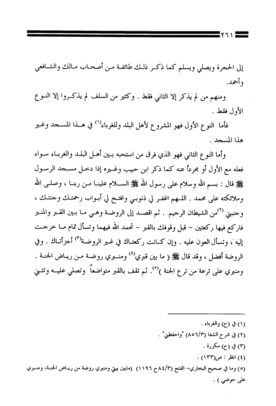 وأما النوع الثاني فهو الذي فرق من استحبه بين أهل البلد والغرباء سواء فعله مع الأول أو مجردًا عنه كما ذكر ابن حبيب وغيره إذا دخل مسجد الرسول صلى الله عليه وسلم قال: بسم الله وسلام على رسول الله صلى الله عليه وسلم السلام علينا من ربنا، وصلى الله وملائكته على محمد. اللهم اغفر لي ذنوبي وافتح لي أبواب رحمتك وجنتك، وجنبني من الشيطان الرجيم. ثم اقصد إلى الروضة وهي ما بين القبر والمنبر فاركع فيها ركعتين -قبل وقوفك بالقبر- تحمد الله فيهما وتسأل تمام ما خرجت إليه، وتسأل العون عليه. وإن كانت ركعتاك في غير الروضة أجزأتاك. وفي الروضة أفضل، وقد قال صلى الله عليه وسلم (ما بين قبري ومنبري روضة من رياض الجنة. ومنبري على ترعة من ترع الجنة). ثم تقف بالقبر متواضعًا وتصلي عليه وتثني