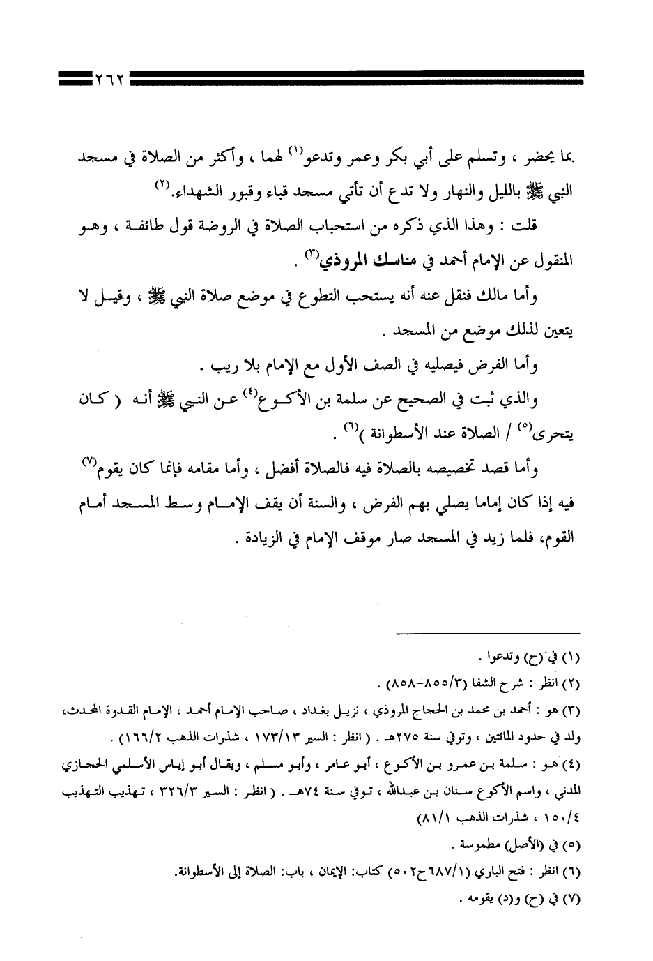 قلت: وهذا الذي ذكره من استحباب الصلاة في الروضة قول طائفة، وهو المنقول عن الإمام أحمد في مناسك المروذي.