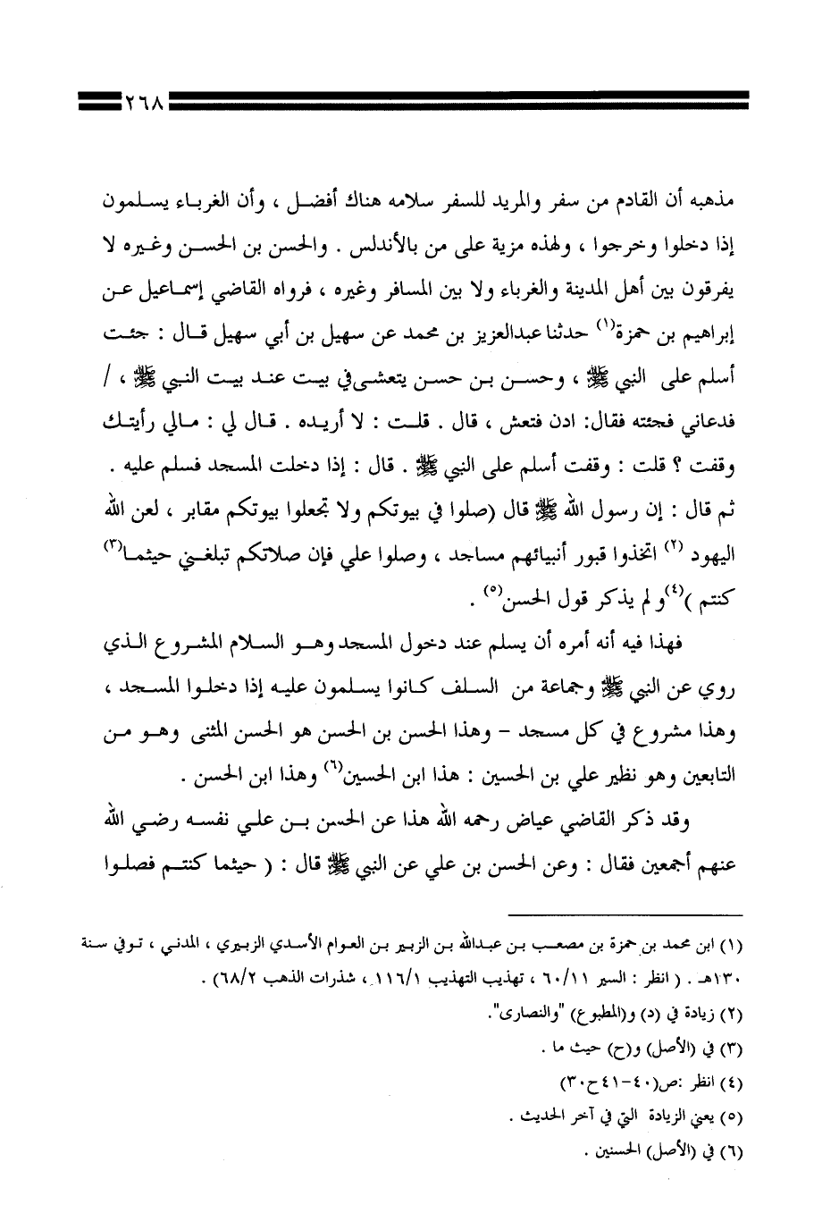 مذهبه أن القادم من سفر والمريد للسفر سلامه هناك أفضل، وأن الغرباء يسلمون إذا دخلوا وخرجوا، ولهذه مزية على من بالأندلس. والحسن بن الحسن وغيره لا يفرقون بين أهل المدينة والغرباء ولا بين المسافر وغيره، فرواه القاضي إسماعيل عن إبراهيم بن حمزة حدثنا عبد العزيز بن محمد عن سهيل بن أبي سهيل قال: جئت أسلم على النبي صلى الله عليه وسلم، وحسن بن حسن يتعشى في بيت عند بيت النبي صلى الله عليه وسلم، / فدعاني فجئته فقال: ادن فتعش، قال: قلت: لا أريده. قال لي: ما لي رأيتك وقفت؟ قلت: وقفت أسلم على النبي صلى الله عليه وسلم. قال: إذا دخلت المسجد فسلم عليه. ثم قال: إن رسول الله صلى الله عليه وسلم قال: (صلوا في بيوتكم ولا تجعلوا بيوتكم مقابر، لعن الله اليهود اتخذوا قبور أنبيائهم مساجد، وصلوا علي فإن صلاتكم تبلغني حيثما كنتم) ولم يذكر قول الحسن.