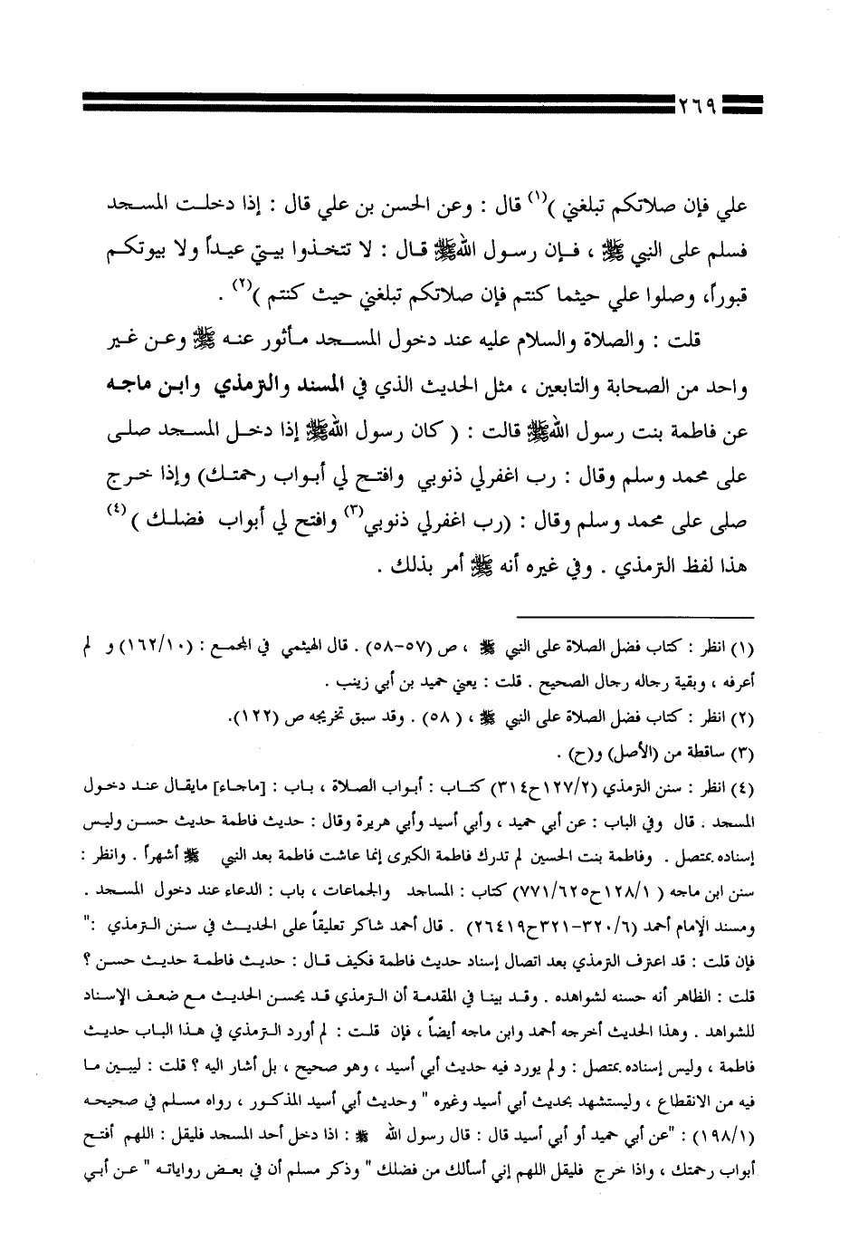 قلت: والصلاة والسلام عليه عند دخول المسجد مأثور عنه صلى الله عليه وسلم وعن غير واحد من الصحابة والتابعين، مثل الحديث الذي في المسند والترمذي وابن ماجه عن فاطمة بنت رسول الله صلى الله عليه وسلم قالت: (كان رسول الله صلى الله عليه وسلم إذا دخل المسجد صلى على محمد وسلم وقال: رب اغفر لي ذنوبي وافتح لي أبواب رحمتك) وإذا خرج صلى على محمد وسلم وقال: (رب اغفر لي ذنوبي وافتح لي أبواب فضلك) هذا لفظ الترمذي. وفي غيره أنه صلى الله عليه وسلم أمر بذلك.