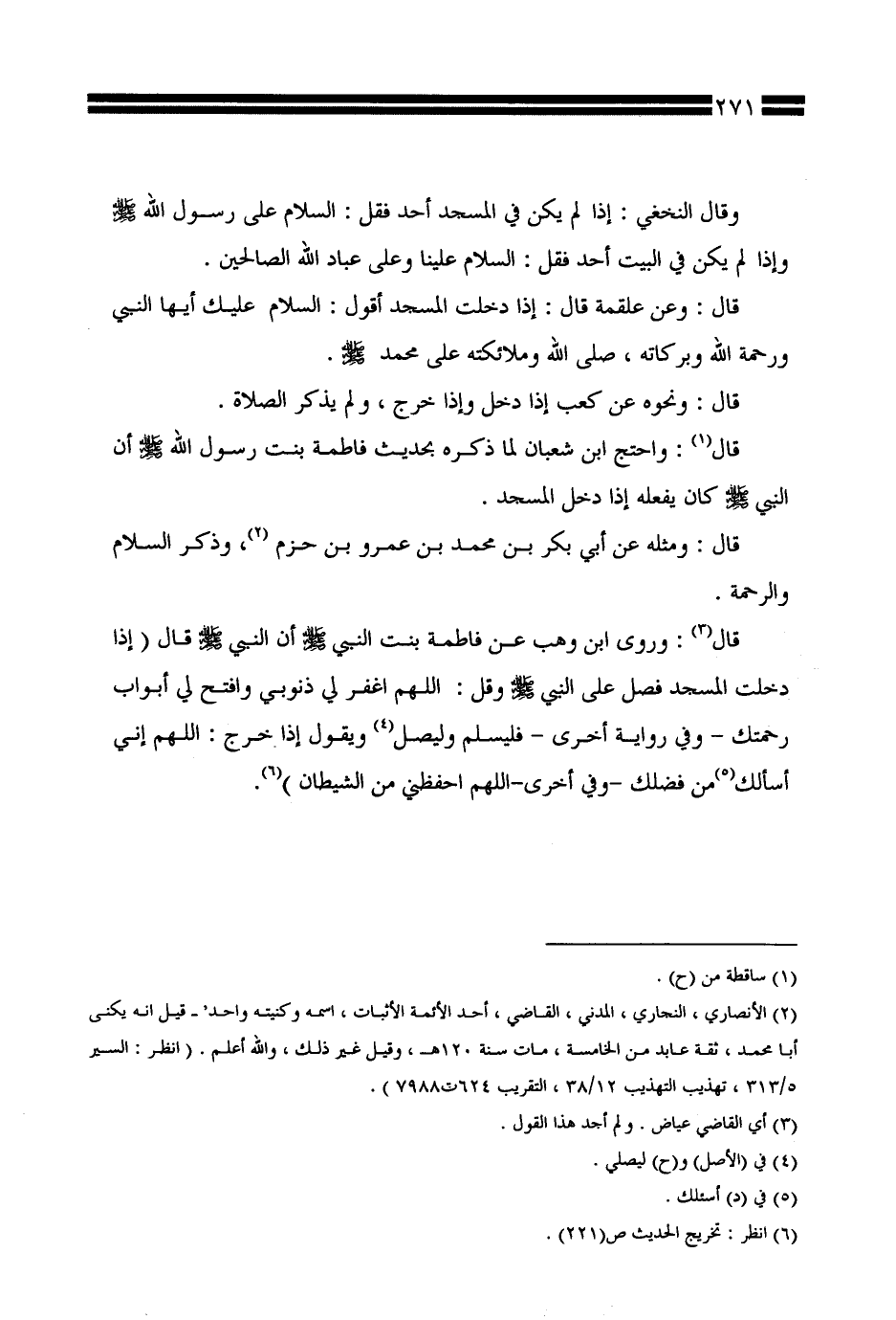 قال: وروى ابن وهب عن فاطمة بنت النبي صلى الله عليه وسلم أن النبي صلى الله عليه وسلم قال (إذا دخلت المسجد فصل على النبي صلى الله عليه وسلم وقل: اللهم اغفر لي ذنوبي وافتح لي أبواب رحمتك -وفي رواية أخرى- فليسلم وليصل ويقول إذا خرج: اللهم إني أسألك من فضلك -وفي رواية أخرى- الله احفظني من الشيطان).