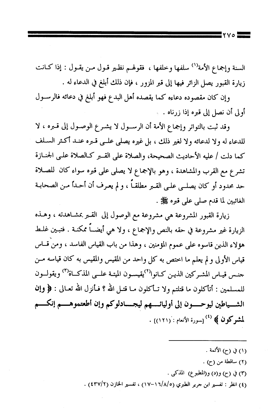 زيارة القبور المشروعة هي مشروعة مع الوصول إلى القبر بمشاهدته، وهذه الزيارة غير مشروعة في حقه بالنص والإجماع، ولا هي أيضًا ممكنة. فتبين غلط هؤلاء الذين قاسوه على عموم المؤمنين، وهذا من باب القياس الفاسد، ومن قاس قياس الأولى ولم يعلم ما اختص به كل واحد من المقيس والمقيس به كان قياسه من جنس قياس المشركين الذين كانوا يقيسون الميتة على المذكاة ويقولون للمسلمين: أتأكلون ما قتلتم ولا تأكلون ما قتل الله؟ فأنزل الله تعالى: {وإن الشياطين ليوحون إلى أوليائهم ليجادلوكم وإن أطعتموهم إنكم لمشركون} [سورة الأنعام: (121)].