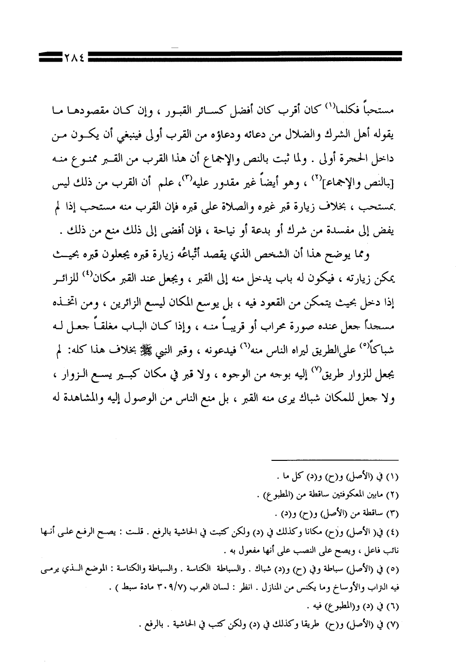 ومما يوضح هذا أن الشخص الذي يقصد أتْباعُه زيارة قبره يجعلون قبره بحيث يمكن زيارته، فيكون له باب يدخل منه إلى القبر، ويجعل عند القبر مكان للزائر إذا دخل بحيث يتمكن من القعود فيه، بل يوسع المكان ليسع الزائرين، ومن اتخذه مسجدًا جعل عنده صورة محراب أو قريبًا منه، وإذا كان الباب مغلقًا جعل له شباكًا على الطريق ليراه الناس منه فيدعونه، وقبر النبي صلى الله عليه وسلم بخلاف هذا كله: لم يجعل للزوار طريق إليه بوجه من الوجوه، ولا قبر في مكان كبير يسع الزوار، ولا جعل للمكان شباك يرى منه القبر، بل منع الناس من الوصول إليه والمشاهدة له.
