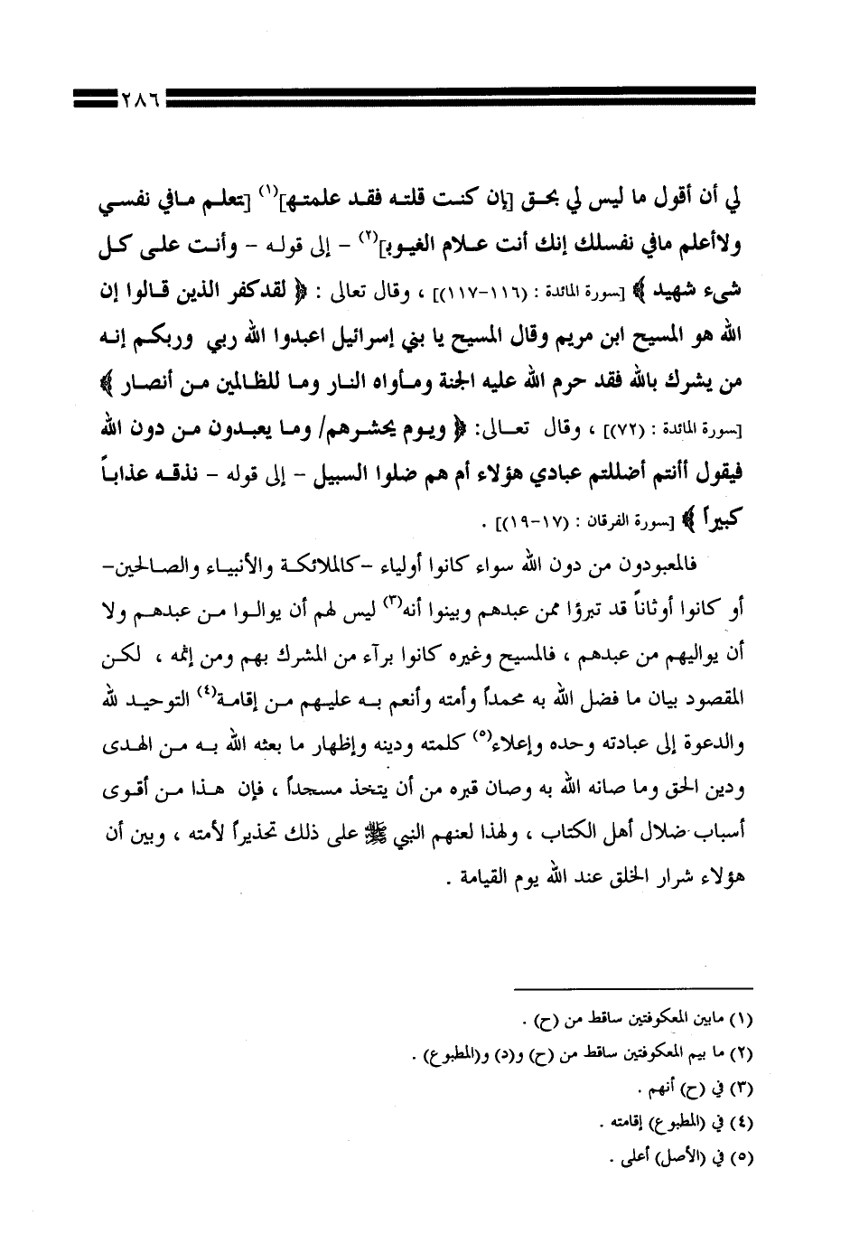 لي أن أقول ما ليس لي بحق [إن كنت قلته فقد علمته] [تعلم ما في نفسي ولا أعلم ما في نفسك إنك أنت علام الغيوب]-إلى قوله- وأنت على كل شيء شهيد} [سورة المائدة: (116 - 117)]، وقال تعالى: {لقد كفر الذين قالوا إن الله هو المسيح ابن مريم وقال المسيح يا بني إسرائيل اعبدوا الله ربي وربكم إنه من يشرك بالله فقد حرم الله عليه الجنة ومأواه النار وما للظالمين من أنصار} [سورة المائدة: (72)]، وقال تعالى: {ويوم يحشرهم / وما يعبدون من دون الله فيقول أأنتم أضللتم عبادي هؤلاء أم هم ضلوا السبيل -إلى قوله- نذقه عذابًا كبيرًا) [سورة الفرقان: (17 - 19)].