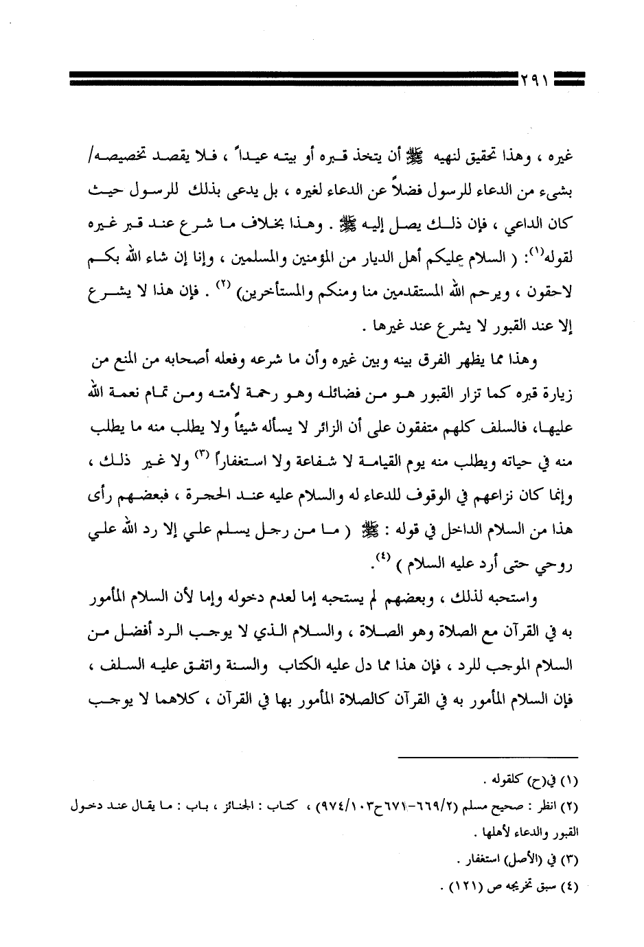 وهذا مما يظهر الفرق بينه وبين غيره وأن ما شرعه وفعله أصحابه من المنع من زيارة قبره كما تزار القبور هو من فضائله وهو رحمة لأمته ومن تمام نعمة الله عليها، فالسلف كلهم متفقون على أن الزائر لا يسأله شيئًا ولا يطلب منه ما يطلب منه في حياته ويطلب منه يوم القيامة لا شفاعة ولا استغفارًا ولا غير ذلك، وإنما كان نزاعهم في الوقوف للدعاء له والسلام عليه عند الحجرة، فبعضهم رأى هذا من السلام الداخل في قوله صلى الله عليه وسلمم: (ما من رجل يسلم علي إلا رد الله علي روحي حتى أرد عليه السلام).