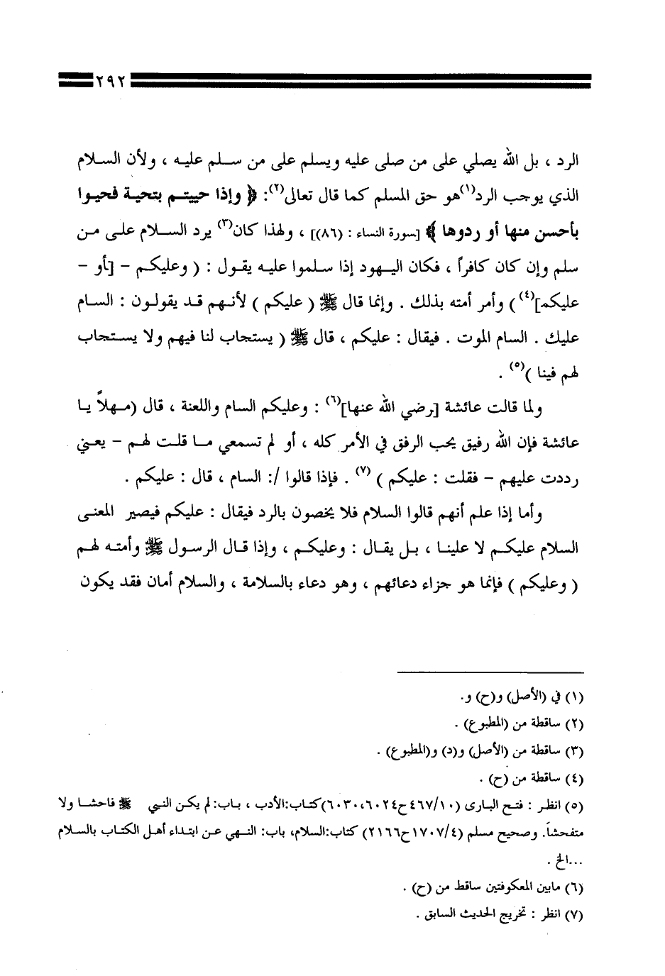 ولما قالت عائشة [رضي الله عنها]: وعليكم السام واللعنة، قال (مهلاً يا عائشة فإن الله رفيق يحب الرفق في الأمر كله، أو لم تسمعي ما قلت لهم -يعنى رددت عليهم- فقلت: عليكم)، فإذا قالوا: / السام، قال: عليكم.