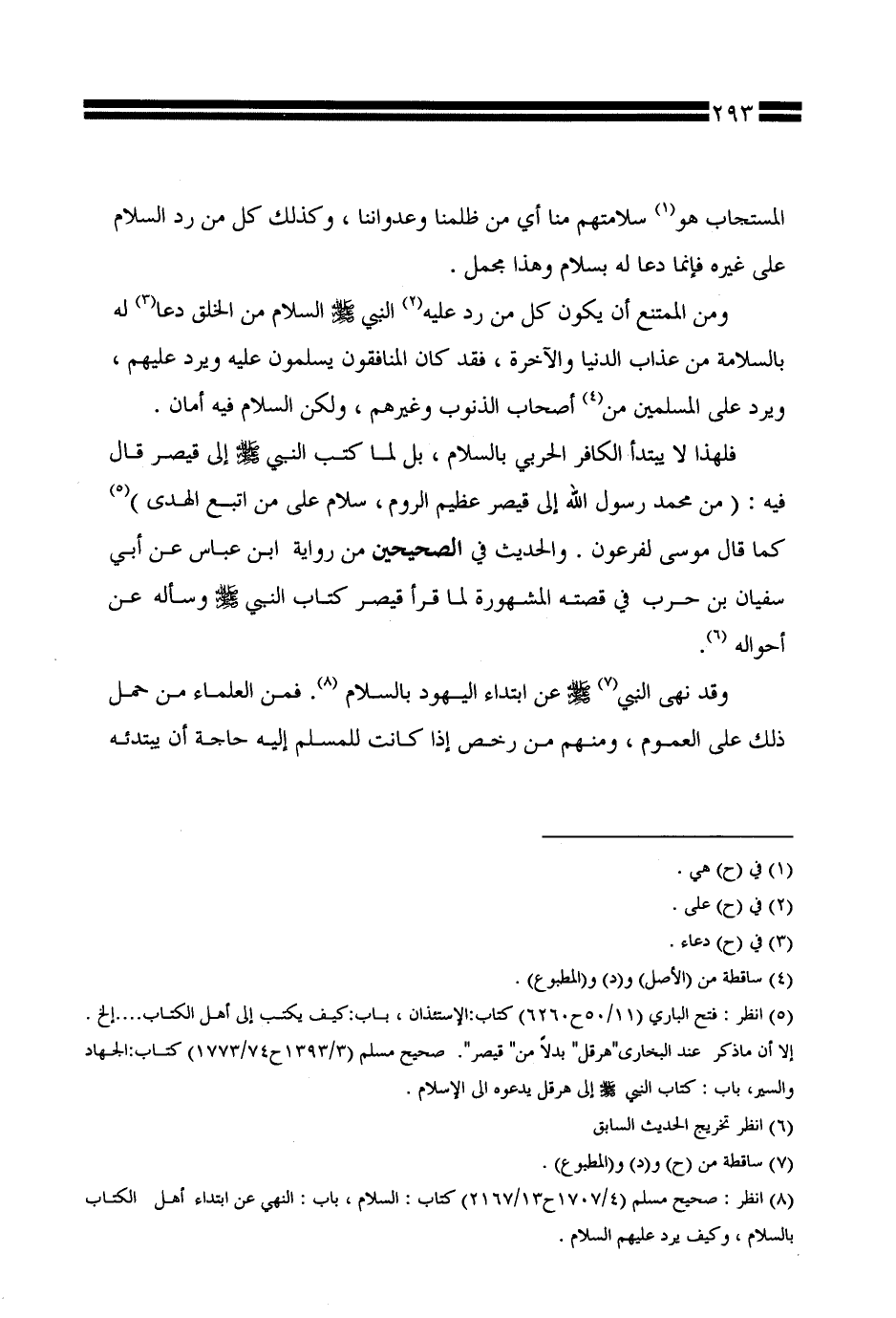فلهذا لا يبتدأ الكافر الحربي بالسلام، بل لما كتب النبي صلى الله عليه وسلم إلى قيصر قال فيه: (من محمد رسول الله إلى قيصر عظيم الروم، سلام على من اتبع الهدى) كما قال موسى لفرعون. والحديث في الصحيحين من رواية ابن عباس عن أبي سفيان بن حرب في قصته المشهورة لما قرأ قيصر كتاب النبي صلى الله عليه وسلم وسأله عن أحواله.