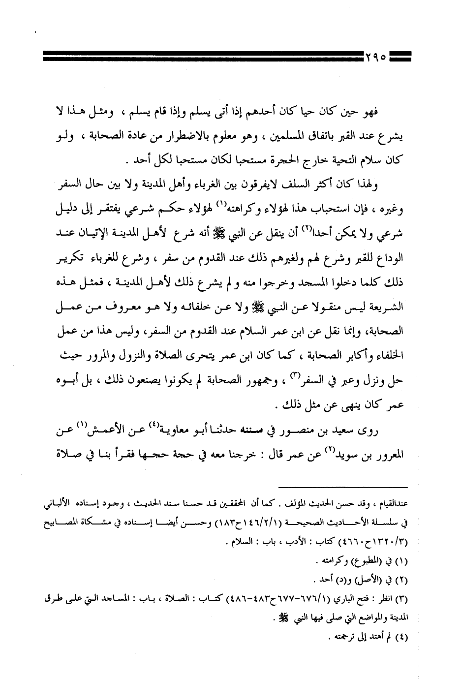 ولهذا كان أكثر السلف لا يفرقون بين الغرباء وأهل المدينة ولا بين حال السفر وغيره، فإن استحباب هذا لهؤلاء وكراهته لهؤلاء حكم شرعي يفتقر إلى دليل شرعي ولا يمكن أحدًا أن ينقل عن النبي صلى الله عليه وسلم أنه شرع لأهل المدينة الإتيان عند الوداع للقبر وشرع لهم ولغيرهم ذلك عند القدوم من سفر، وشرع للغرباء تكرير ذلك كلما دخلوا المسجد وخرجوا منه ولم يشرع ذلك لأهل المدينة، فمثل هذه الشريعة ليس منقولاً عن النبي صلى الله عليه وسلم ولا عن خلفائه ولا هو معروف من عمل الصحابة، وإنما نقل عن ابن عمر السلام عند القدوم من السفر، وليس هذا من عمل الخلفاء وأكابر الصحابة، كما كان ابن عمر يتحرى الصلاة والنزول والمرور حيث حل ونزل وعبر في السفر، وجمهور الصحابة لم يكونوا يصنعون ذلك، بل أبوه عمر كان ينهى عن مثل ذلك.