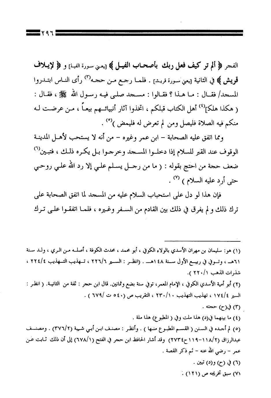 الفجر {ألم تر كيف فعل ربك بأصحاب الفيل} [يعنى سورة الفيل] و {لإيلاف قريش} في الثانية [يعنى سورة قريش]. فلما رجع من حجه رأى الناس ابتدروا المسجد / فقال: ما هذا؟ فقالوا: مسجد صلى فيه رسول الله صلى الله عليه وسلم، فقال: ([هكذا هلك] أهل الكتاب قبلكم، اتخذوا آثار أنبيائهم بيعًا، من عرضت له منكم فيه الصلاة فليصل ومن لم تعرض له فليمض).