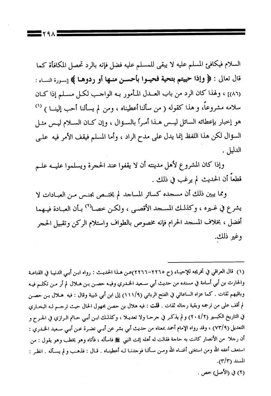 السلام فيكافئ المسلم عليه لا يبقى للمسلم عليه فضل فإنه بالرد تحصل المكافأة كما قال تعالى: {وإذا حييتم بتحية فحيوا بأحسن منها أو ردوها} [سورة النساء: (86)]، ولهذا كان الرد من باب العدل المأمور به الواجب لكل مسلم إذا كان سلامه مشروعًا، وهذا كقوله (من سألنا أعطيناه، ومن لم يسألنا أحب إلينا) هو إخبار بإعطائه السائل ليس هذا أمرًا بالسؤال، وإن كان السلام ليس مثل السؤال لكن هذا اللفظ إنما يدل على مدح الراد، وأما المسلم فيقف الأمر فيه على الدليل.