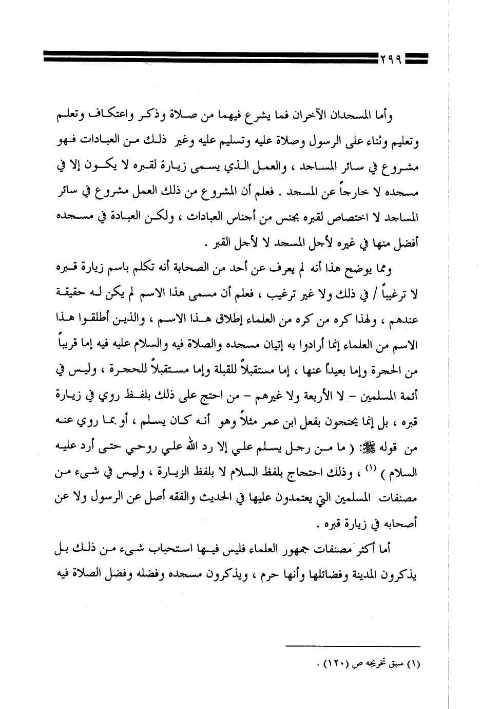 وأما المسجدان الآخران فما يشرع فيهما من صلاة وذكر واعتكاف وتعلم وتعليم وثناء على الرسول وصلاة عليه وتسليم عليه وغير ذلك من العبادات فهو مشروع في سائر المساجد، والعمل الذي يسمى زيارة لقبره لا يكون إلا في مسجده لا خارجًا عن المسجد. فعلم أن المشروع من ذلك العمل مشروع في سائر المساجد لا اختصاص لقبره بجنس من أجناس العبادات، ولكن العبادة في مسجده أفضل منها في غيره لأجل المسجد لا لأجل القبر.