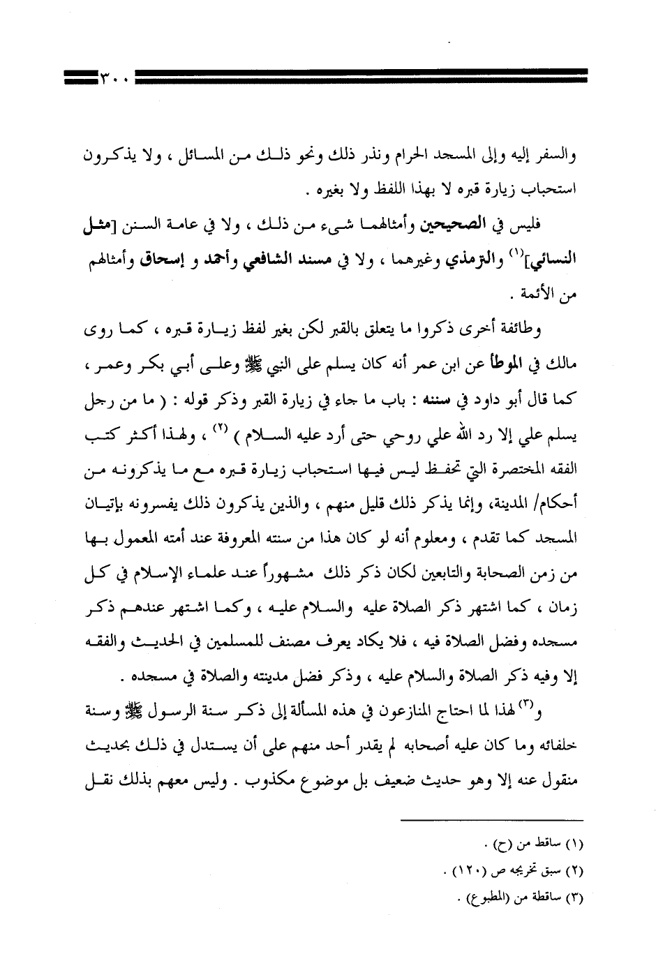 وطائفة أخرى ذكروا ما يتعلق بالقبر لكن بغير لفظ زيارة قبره، كما روى مالك في الموطأ عن ابن عمر أنه كان يسلم على النبي صلى الله عليه وسلم وعلى أبي بكر وعمر، كما قال أبو داود في سننه: باب ما جاء في زيارة القبر وذكر قوله: (ما من رجل يسلم علي إلا رد الله علي روحي حتى أرد عليه السلام)، ولهذا أكثر كتب الفقه المختصرة التي تحفظ ليس فيها استحباب زيارة قبره مع ما يذكرونه من أحكام / المدينة، وإنما يذكر ذلك قليل منهم، والذين يذكرون ذلك يفسرونه بإتيان المسجد كما تقدم، ومعلوم أنه لو كان هذا من سنته المعروفة عند أمته المعمول بها من زمن الصحابة والتابعين لكان ذكر ذلك مشهورًا عند علماء الإسلام في كل زمان، كما اشتهر ذكر الصلاة عليه والسلام عليه، وكما اشتهر عندهم ذكر مسجده وفضل الصلاة فيه، فلا يكاد يعرف مصنف للمسلمين في الحديث والفقه إلا وفيه ذكر الصلاة والسلام عليه، وذكر فضل مدينته والصلاة في مسجده.