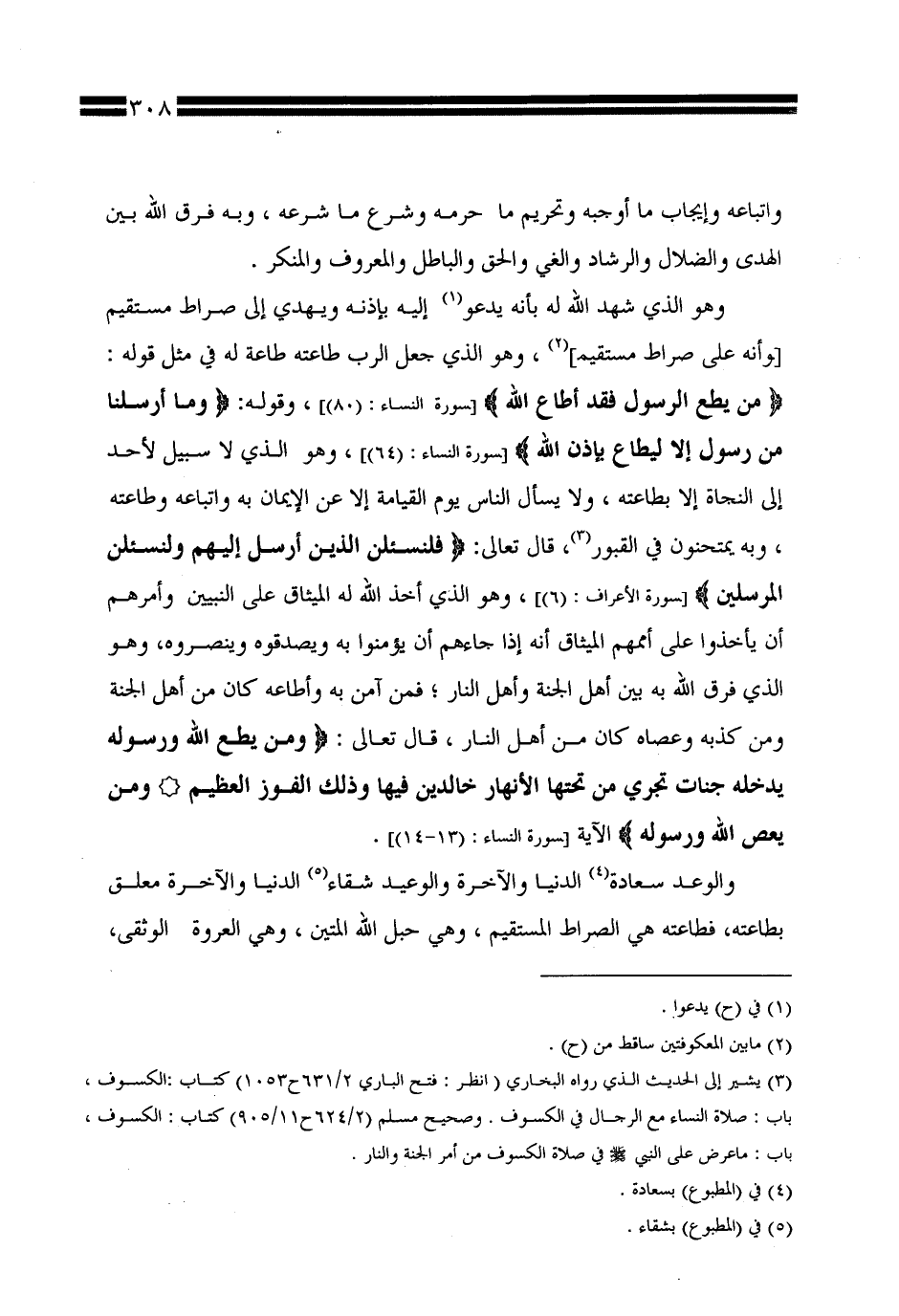 والوعد سعادة الدنيا والآخرة والوعيد شقاء الدنيا والآخرة معلق بطاعته، فطاعته هي الصراط المستقيم، وهي حبل الله المتين، وهي العروة الوثقى،