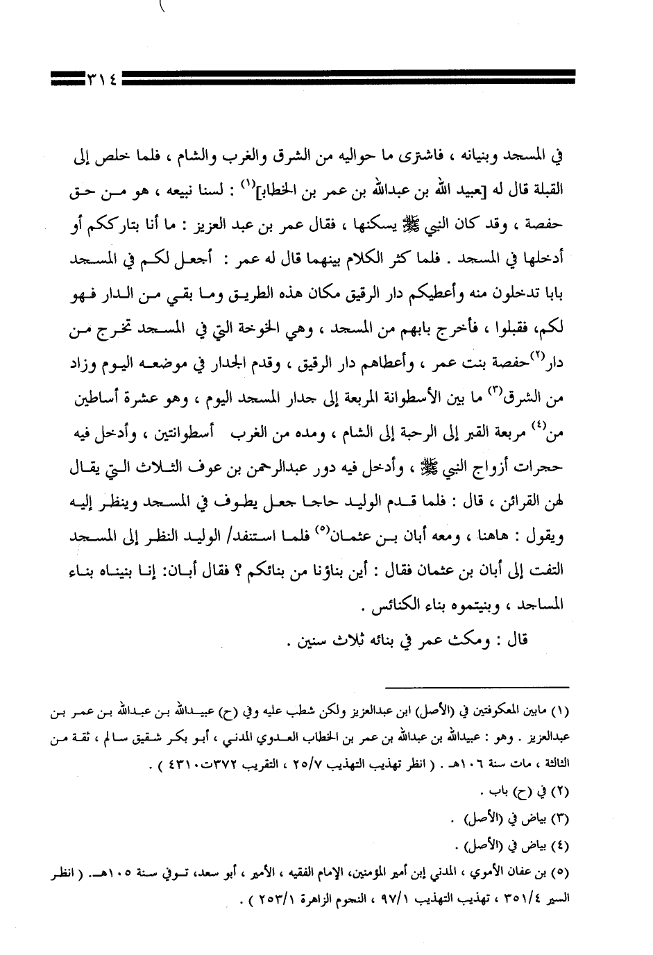 في المسجد وبنيانه، فاشترى ما حواليه من الشرق والغرب والشام، فلما خلص إلى القبلة قال له [عبيد الله بن عبد الله بن عمر بن الخطاب]: لسنا نبيعه، هو من حق حفصة، وقد كان النبي صلى الله عليه وسلم يسكنها، فقال عمر بن عبد العزيز: ما أنا بتارككم أو أدخلها في المسجد. فلما كثر الكلام بينهما قال له عمر: أجعل لكم في المسجد بابًا تدخلون منه وأعطيكم دار الرقيق مكان هذه الطريق وما بقي من الدار فهو لكم، فقبلوا، فأخرج بابهم من المسجد، وهي الخوخة التي في المسجد تخرج من دار حفصة بنت عمر، وأعطاهم دار الرقيق، وقدم الجدار في موضعه اليوم وزاد من الشرق ما بين الأسطوانة المربعة إلى جدار المسجد اليوم، وهو عشرة أساطين من مربعة القبر إلى الرحبة إلى الشام، ومده من الغرب أسطوانتين، وأدخل فيه حجرات أزواج النبي صلى الله عليه وسلم، وأدخل فيه دور عبد الرحمن بن عوف الثلاث التي يقال لهن القرائن، قال: فلما قدم الوليد حاجًّا جعل يطوف في المسجد وينظر إليه ويقول: هاهنا، ومعه أبان بن عثمان فلما استنفد / الوليد النظر إلى المسجد التفت إلى أبان بن عثمان فقال: أين بناؤنا من بنائكم؟ فقال أبان: إنا بنيناه بناء المساجد، وبنيتموه بناء الكنائس.