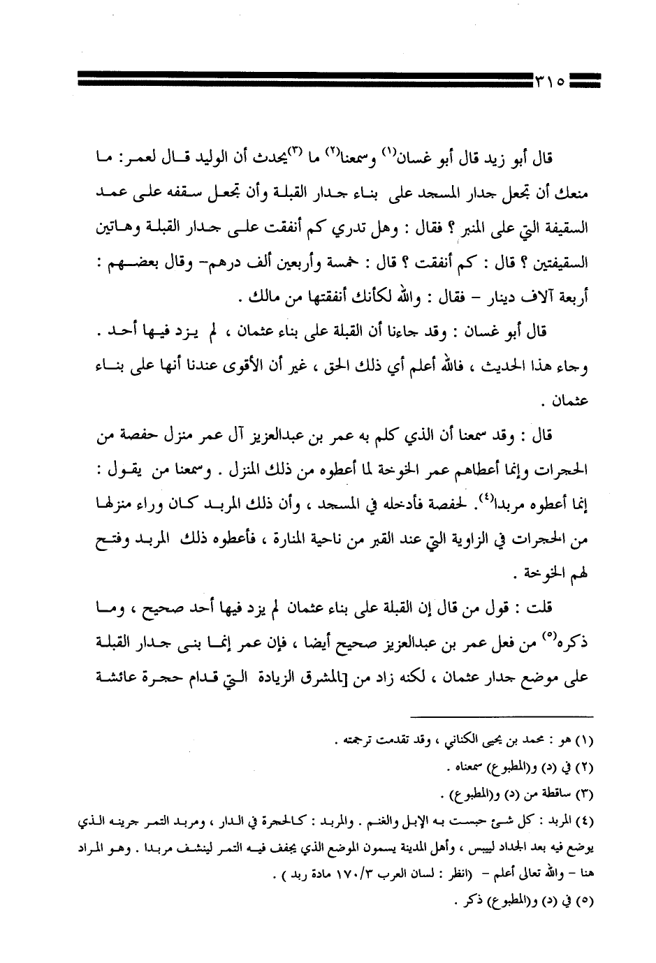قال أبو زيد قال أبو غسان وسمعنا ما يحدث أن الوليد قال لعمر: ما منعك أن تجعل جدار المسجد على بناء جدار القبلة وأن تجعل سقفه على عمد السقيفة التي على المنبر؟ فقال: وهل تدري كم أنفقت على جدار القبلة وهاتين السقيفتين؟ قال: كم أنفقت؟ قال: خمسة وأربعين ألف درهم -وقال بعضهم: أربعة ألاف دينار- فقال: والله لكأنك أنفقتها من مالك.