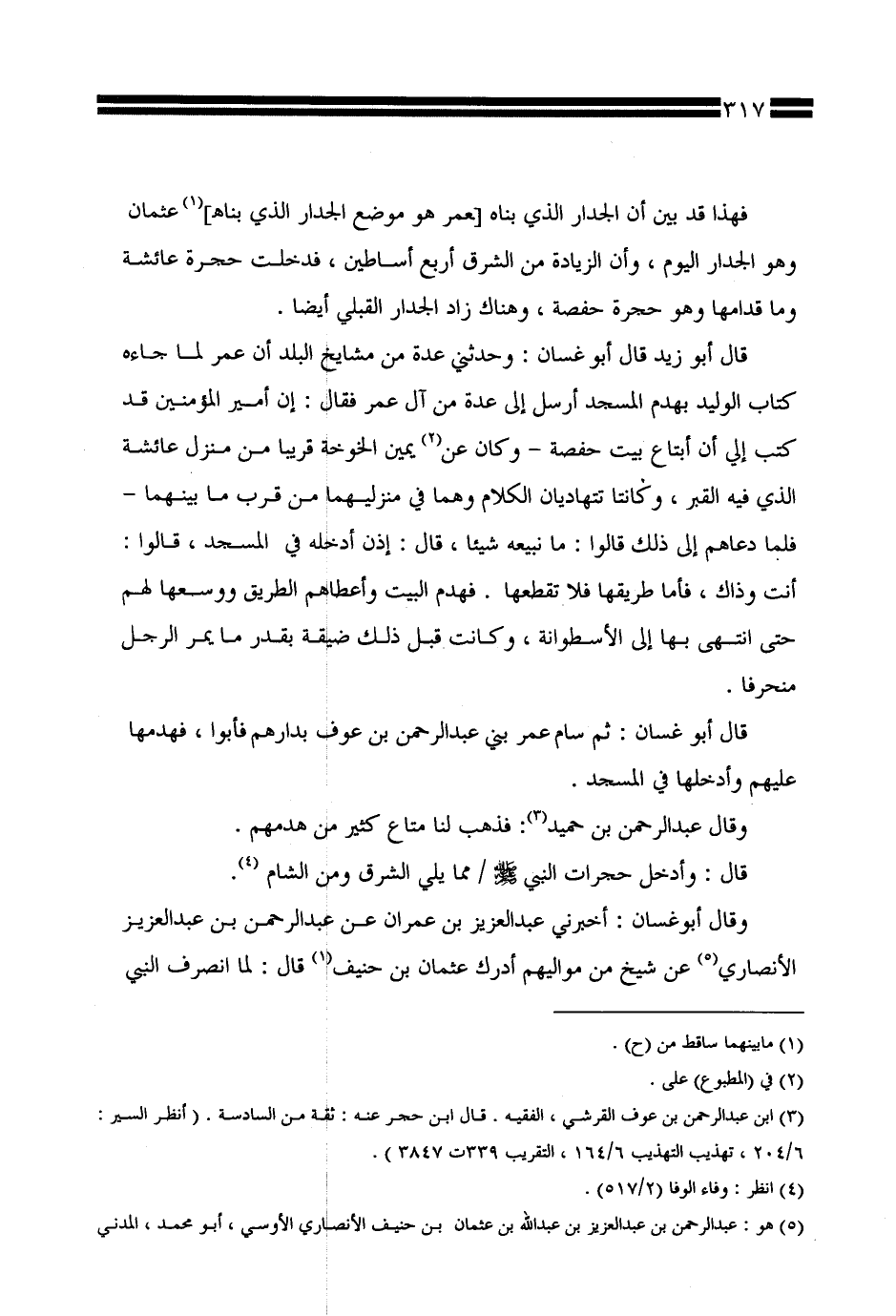 قال أبو غسان: ثم سام عمر بني عبد الرحمن بن عوف بدارهم فأبوا، فهدمها عليهم وأدخلها في المسجد.