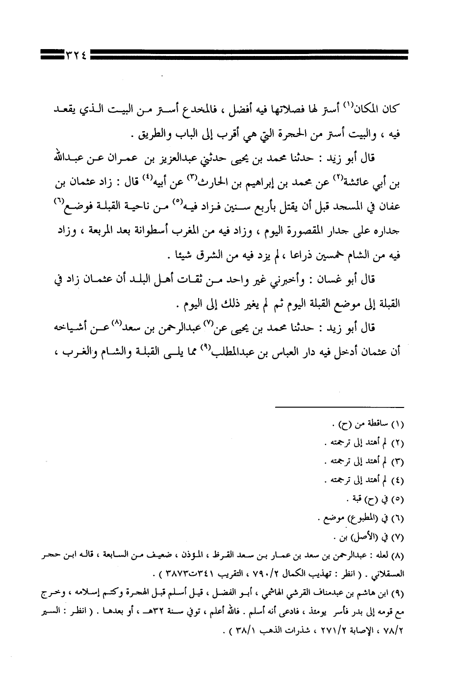 قال أبو زيد: حدثنا محمد بن يحيى عن عبد الرحمن بن سعد عن أشياخه أن عثمان أدخل فيه دار العباس بن عبد المطلب مما يلي القبلة والشام والغرب،