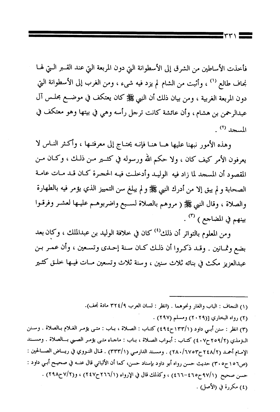 وهذه الأمور نبهنا عليها ها هنا فإنه يحتاج إلى معرفتها، وأكثر الناس لا يعرفون الأمر كيف كان، ولا حكم الله ورسوله في كثير من ذلك، وكان من المقصود أن المسجد لما زاد فيه الوليد وأدخلت فيه الحجرة كان قد مات عامة الصحابة ولم يبق إلا من أدرك النبي صلى الله عليه وسلم ولم يبلغ سن التمييز الذي يؤمر فيه بالطهارة والصلاة، وقال النبي صلى الله عليه وسلم (مروهم بالصلاة لسبع واضربوهم عليها لعشر وفرقوا بينهم في المضاجع).