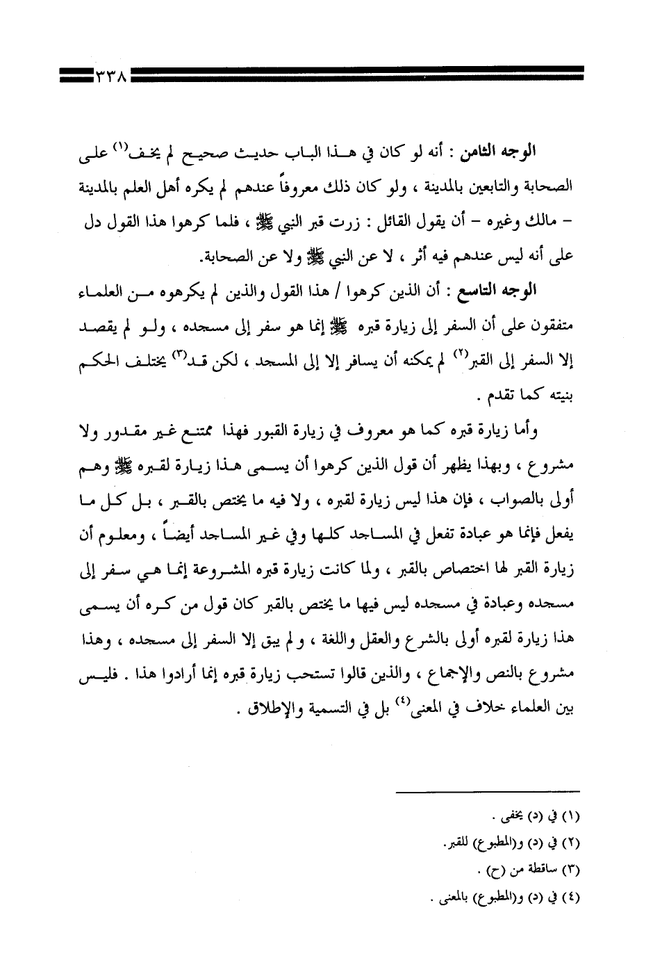 الوجه التاسع: أن الذين كرهوا / هذا القول والذين لم يكرهوه من العلماء متفقون على أن السفر إلى زيارة قبره صلى الله عليه وسلم إنما هو سفر إلى مسجده، ولو لم يقصد إلا السفر إلى القبر لم يمكنه أن يسافر إلا إلى المسجد، لكن قد يختلف الحكم بنيته كما تقدم.