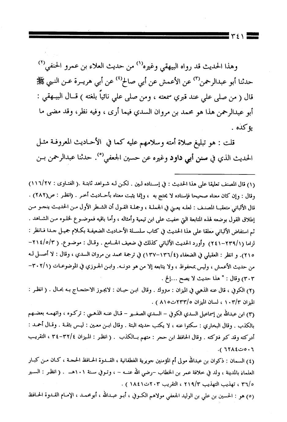 وهذا الحديث قد رواه البيهقي وغيره من حديث العلاء بن عمرو الحنفي حدثنا أبو عبد الرحمن عن الأعمش عن أبي صالح عن أبي هريرة عن النبي صلى الله عليه وسلم قال (من صلى علي عند قبري سمعته، ومن صلى علي نائيًا بلغته) قال البيهقي: أبو عبد الرحمن هذا هو محمد بن مروان السدي فيما أرى، وفيه نظر، وقد مضى ما يؤكده.