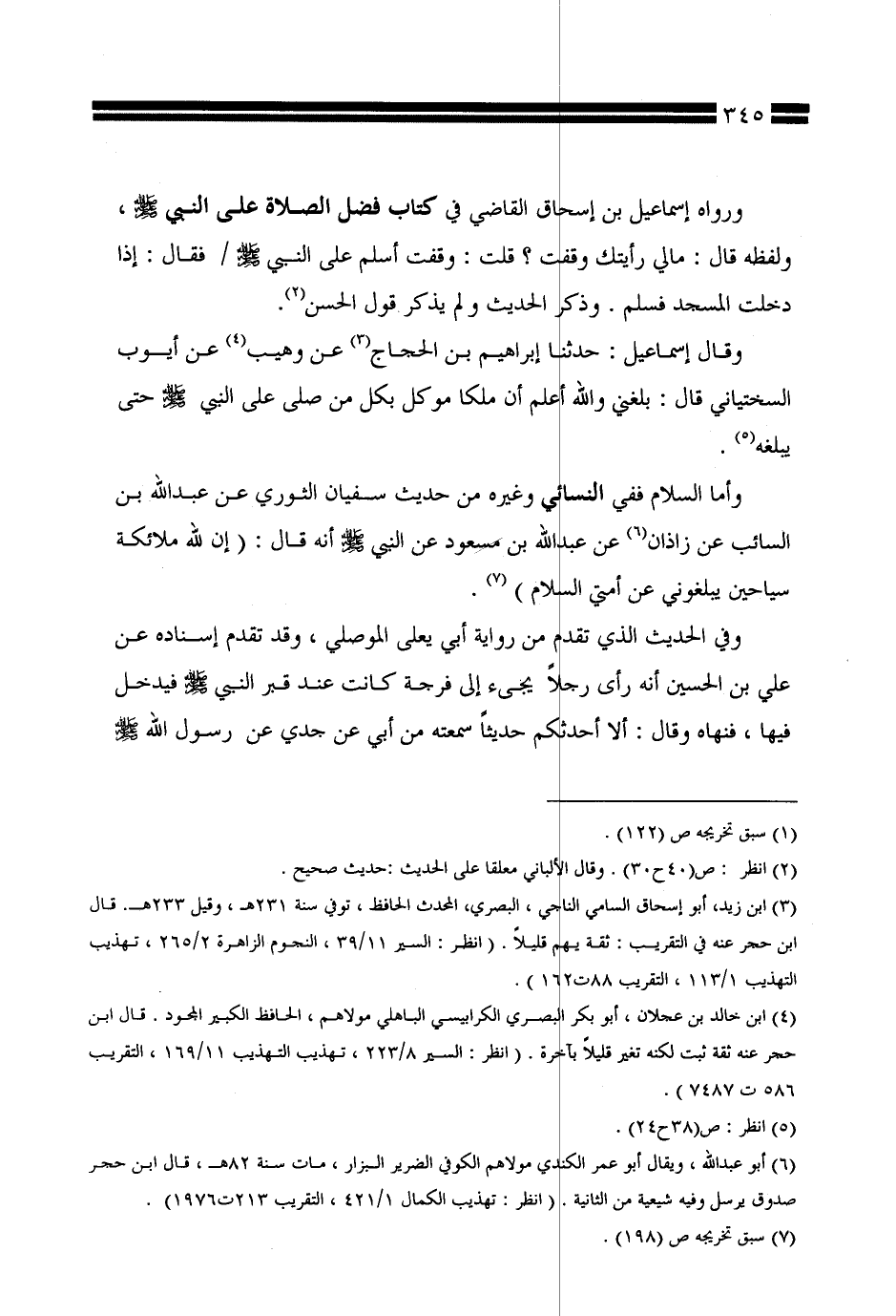 وقال إسماعيل: حدثنا إبراهيم بن الحجاج عن وهيب عن أيوب السختياني قال: بلغني والله أعلم أن ملكًا موكل بكل من صلى على النبي صلى الله عليه وسلم حتى يبلغه.