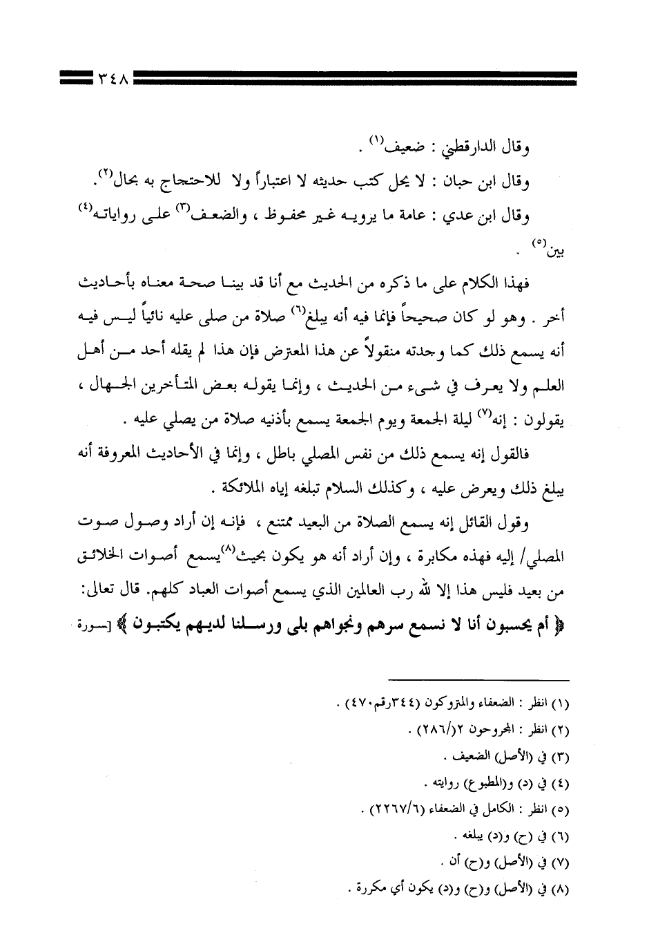 فهذا الكلام على ما ذكره من الحديث مع أنا قد بينا صحة معناه بأحاديث أخر. وهو لو كان صحيحًا فإنما فيه أنه يبلغ صلاة من صلى عليه نائيًا ليس فيه أنه يسمع ذلك كما وجدته منقولاً عن هذا المعترض فإنهذا لم يقله أحد من أهل العلم ولا يعرف في شيء من الحديث، وإنما يقوله بعض المتأخرين الجهال، يقولون: إنه ليلة الجمعة ويوم الجمعة يسمع بأذنيه صلاة من يصلي عليه.