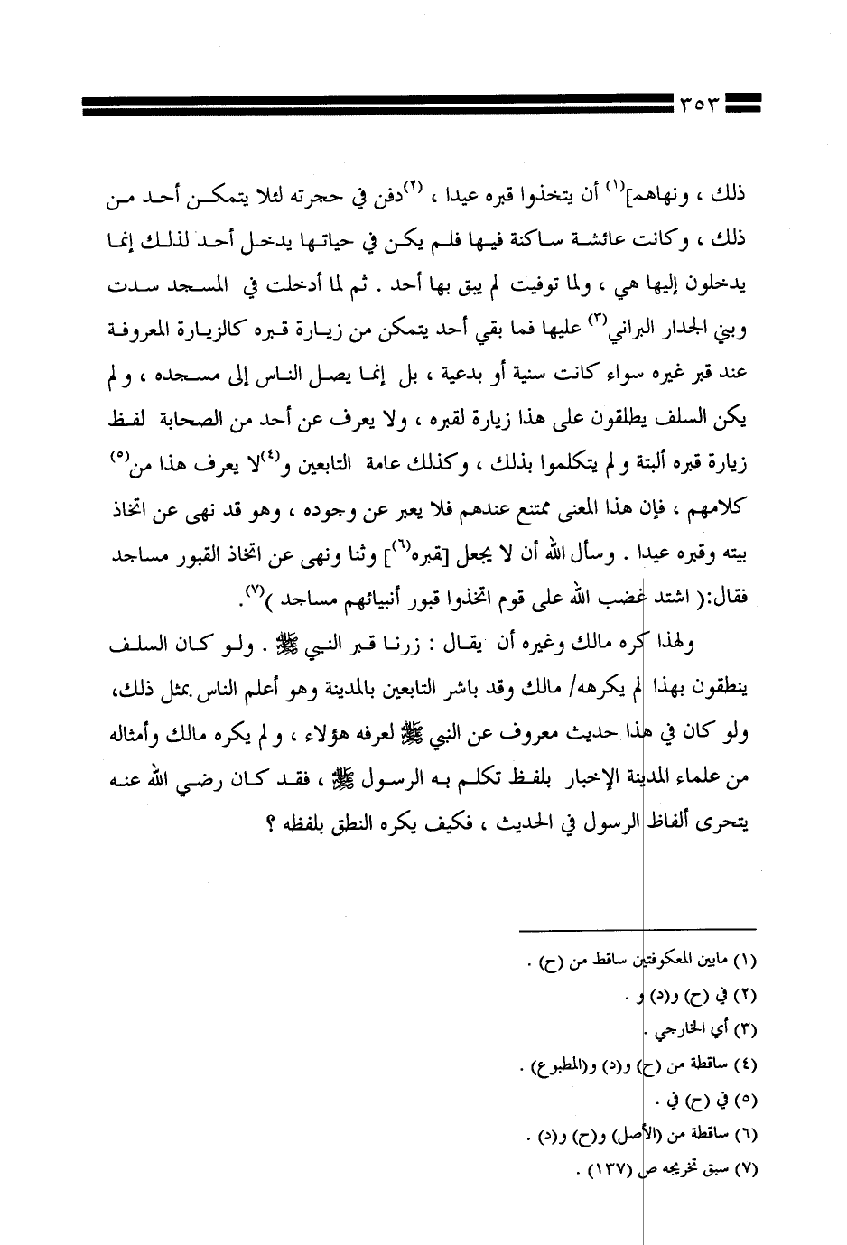 ذلك ونهاهم] أن يتخذوا قبره عيدًا، دفن في حجرته لئلا يتمكن أحد من ذلك، وكانت عائشة ساكنة فيها فلم يكن في حياتها يدخل أحد لذلك إنما يدخلون إليها هي، ولما توفيت لم يبق بها أحد. ثم لما أدخلت في المسجد سدت وبني الجدار البراني عليها فما بقي أحد يتمكن من زيارة قبره كالزيارة المعروفة عند قبر غيره سواء كانت سنية أو بدعية، بل إنما يصل الناس إلى مسجده، ولم يكن السلف يطلقون على هذا زيارة لقبره، ولا يعرف عن أحد من الصحابة لفظ زيارة قبره ألبتة ولم يتكلموا بذلك، وكذلك عامة التابعين ولا يعرف هذا من كلامهم، فإن هذا المعنى ممتنع عندهم فلا يعبر عن وجوده، وهو قد نهى عن اتخاذ بيته وقبره عيدًا. وسأل الله أن لا يجعل [قبره] وثنًا ونهى عن اتخاذ القبور مساجد فقال: (اشتد غضب الله على قوم اتخذوا قبور أنبيائهم مساجد).