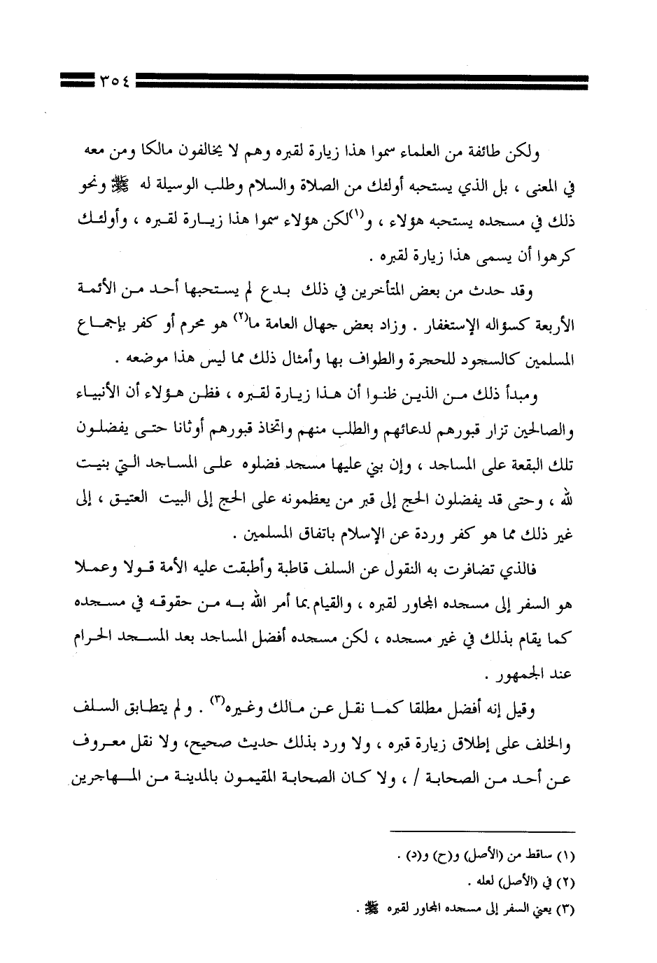 فالذي تضافرت به النقول عن السلف قاطبة وأطبقت عليه الأمة قولاً وعملاً هو السفر إلى مسجده المجاور لقبره، والقيام بما أمر الله به من حقوقه في مسجده كما يقام بذلك في غير مسجده، لكن مسجده أفضل المساجد بعد المسجد الحرام عند الجمهور.