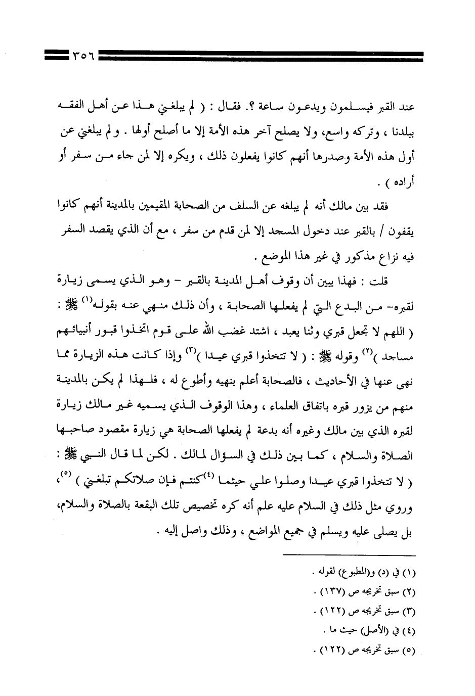 فقد بين مالك أنه لم يبلغه عن السلف من الصحابة المقيمين بالمدينة أنهم كانوا يقفون / بالقبر عند دخول المسجد إلا لمن قدم من سفر، مع أن الذي يقصد السفر فيه نزاع مذكور في غير هذا الموضع.