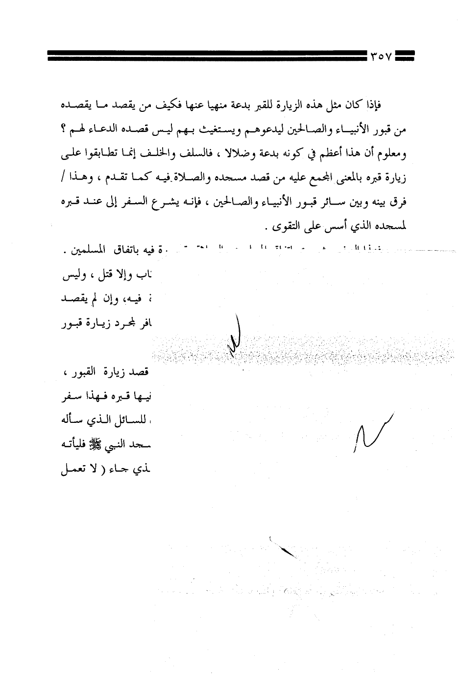 فإذا كان مثل هذه الزيارة للقبر بدعة منهيًّا عنها فكيف من يقصد ما يقصده من قبور الأنبياء والصالحين ليدعوهم ويستغيث بهم ليس قصده الدعاء لهم؟ ومعلوم أن هذا أعظم في كونه بدعة وضلالاً، فالسلف والخلف إنما تطابقوا على زيارة قبره بالمعنى المجمع عليه من قصد مسجده والصلاة فيه كما تقدم، وهذا / فرق يينه وبين سائر قبور الأنبياء والصالحين، فإنه يشرع السفر إلى عند قبره لمسجده الذي أسس على التقوى.