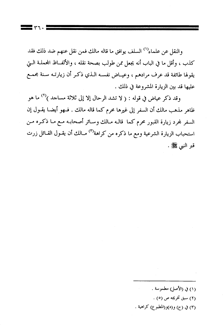وقد ذكر عياض في قوله: (لا تشد الرحال إلا إلى ثلاثة مساجد) ما هو ظاهر مذهب مالك أن السفر إلى غيرها محرم كما قاله مالك. فهو أيضًا يقول إن السفر لمجرد زيارة القبور محرم كما قاله مالك وسائر أصحابه مع ما ذكره من استحباب الزيارة الشرعية ومع ما ذكره من كراهة مالك أن يقول القائل زرت قبر النبي صلى الله عليه وسلم.