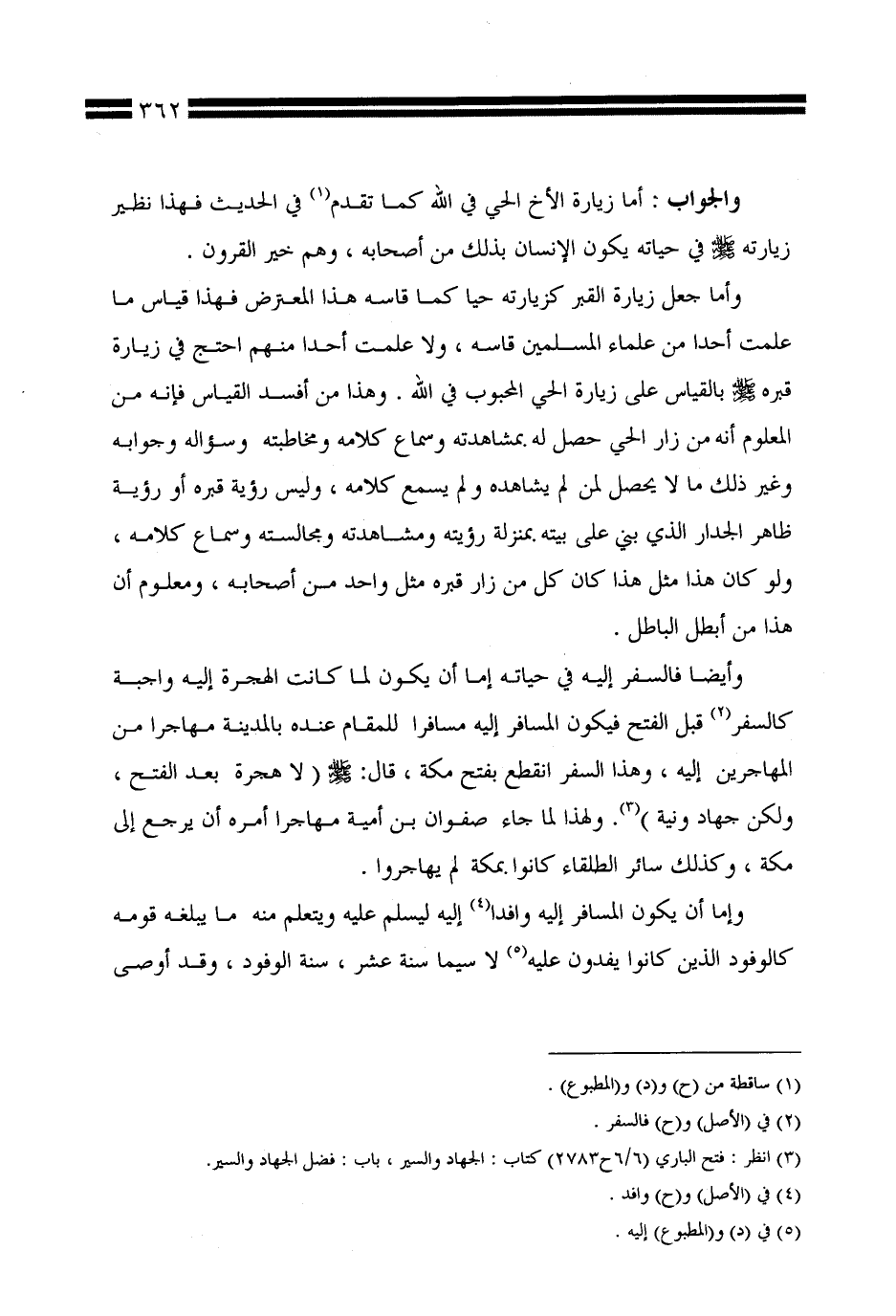 وأيضًا فالسفر إليه في حياته إما أن يكون لما كانت الهجرة إليه واجبة كالسفر قبل الفتح فيكون المسافر إليه مسافرًا للمقام عنده بالمدينة مهاجرًا من المهاجرين إليه، وهذا السفر انقطع بفتح مكة، قال صلى الله عليه وسلم: (لا هجرة بعد الفتح، ولكن جهاد ونية). ولهذا لما جاء صفوان بن أمية مهاجرًا أمره أن يرجع إلى مكة، وكذلك سائر الطلقاء كانوا بمكة لم يهاجروا.