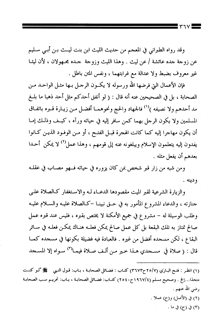 فإن الأعمال التي فرضها الله ورسوله لا يكون الرجل بها مثل الواحد من الصحابة، بل في الصحيحين عنه أنه قال: (لو أنفق أحدكم مثل أحد ذهبًا ما بلغ مد أحدهم ولا نصيفه) فالجهاد والحج ونحوهما أفضل من زيارة قبره باتفاق المسلمين ولا يكون الرجل بهما كمن سافر إليه في حياته ورآه، كيف وذلك إما أن يكون مهاجرًا إليه كما كانت الهجرة قبل الفتح، أو من الوفود الذين كانوا يفدون إليه يتعلمون الإسلام ويبلغونه عنه إلى قومهم، وهذا عمل لا يمكن أحدًا بعدهم أن يفعل مثله.
