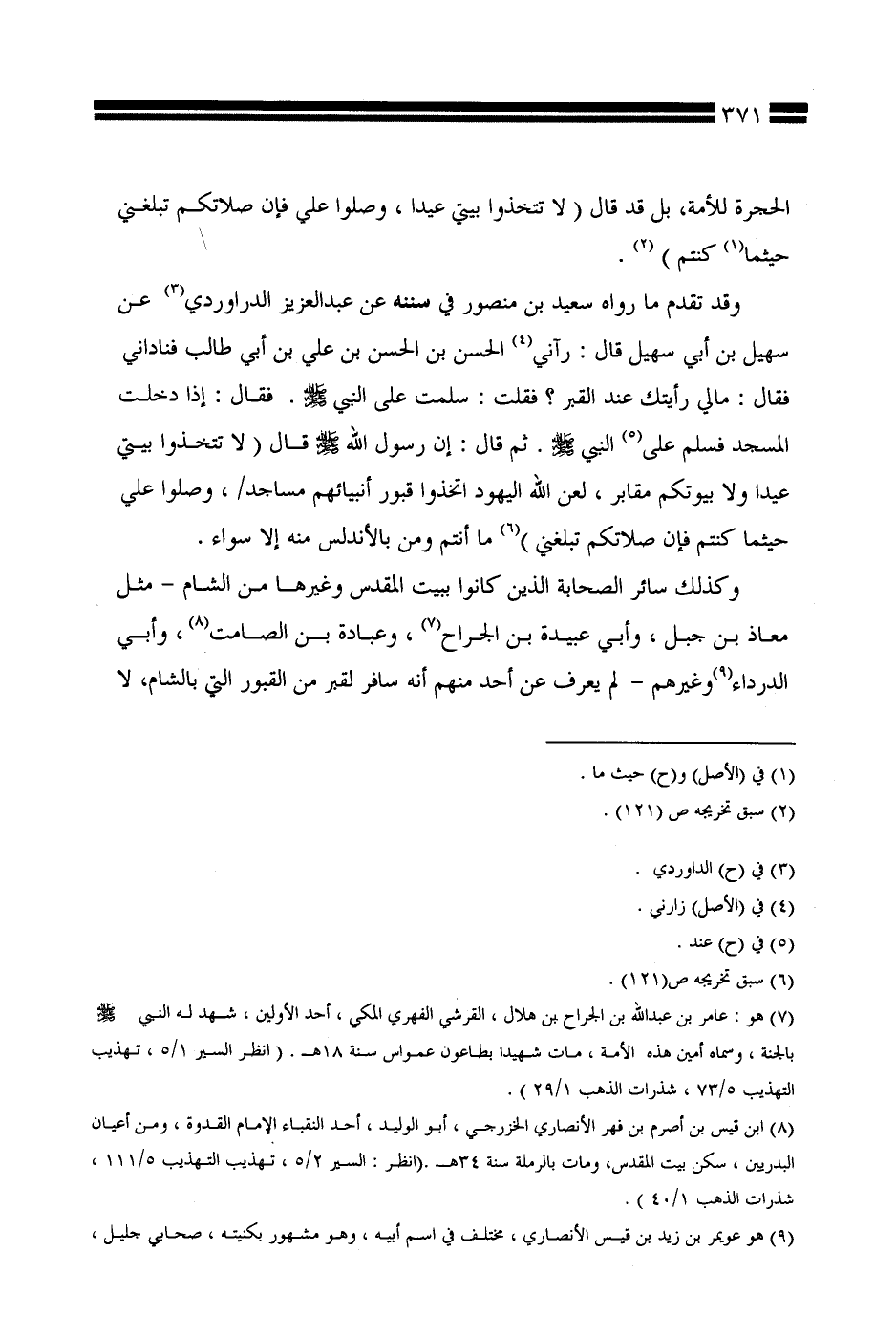 وقد تقدم ما رواه سعيد بن منصور في سننه عن عبد العزيز الدراوردي عن سهيل بن أبي سهيل قال: رآني الحسن بن الحسن بن علي بن أبي طالب فناداني فقال: ما لي رأيتك عند القبر؟ فقلت: سلمت على النبي صلى الله عليه وسلم. فقال: إذا دخلت المسجد فسلم على النبي صلى الله عليه وسلم. ثم قال: إن رسول الله صلى الله عليه وسلم قال: (لا تتخذوا بيتي عيدًا ولا بيوتكم مقابر، لعن الله اليهود اتخذوا قبور أنبيائهم مساجد، / وصلوا علي حيثما كنتم فإن صلاتكم تبلغني) ما أنتم ومن بالأندلس منه إلا سواء.