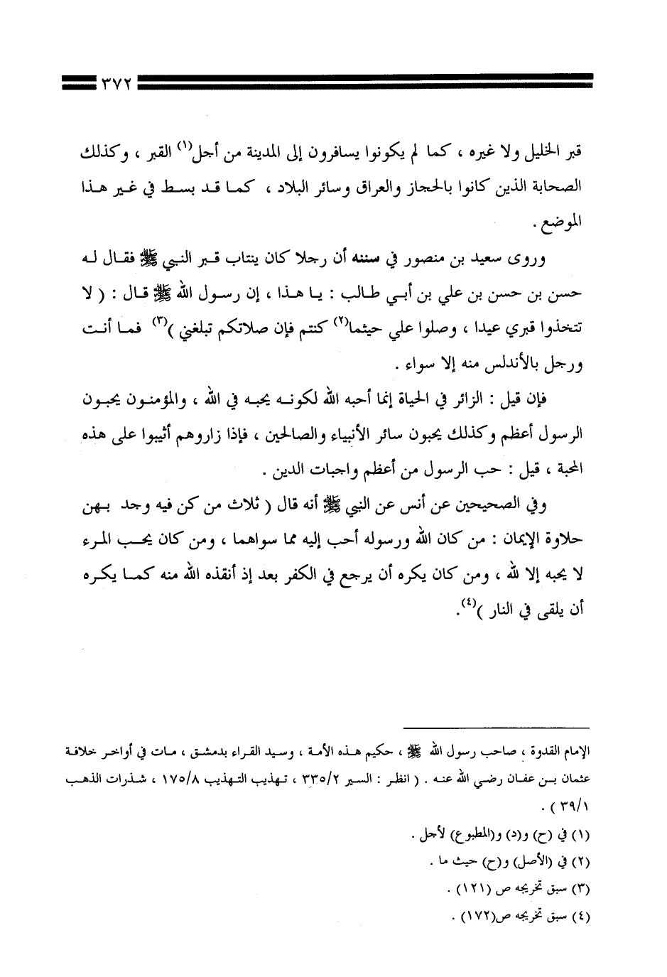 فإن قيل: الزائر في الحياة إنما أحبه الله لكونه يحبه في الله، والمؤمنون يحبون الرسول أعظم وكذلك يحبون سائر الأنبياء والصالحين، فإذا زاروهم أثيبوا على هذه المحبة، قيل: حب الرسول من أعظم واجبات الدين.