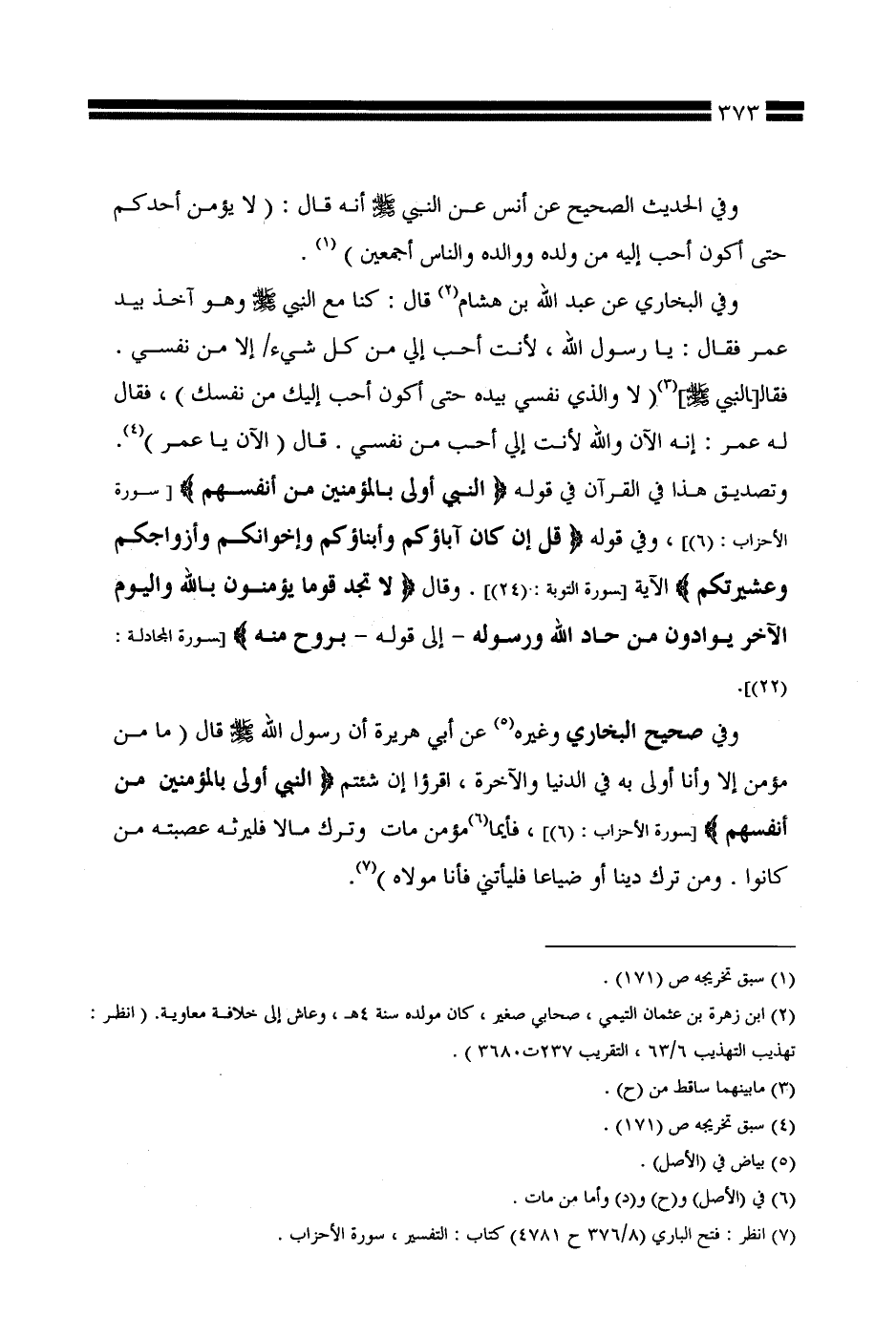 وفي البخاري عن عبد الله بن هشام قال: كنا مع النبي صلى الله عليه وسلم وهو آخذ بيد عمر فقال: يا رسول الله، لأنت أحب إلي من كل شيء / إلا من نفسي. فقال [النبي صلى الله عليه وسلم] (لا والذي نفسي بيده حتى أكون أحب إليك من نفسك)، فقال له عمر: إنه الآن والله لأنت إلي أحب من نفسي. قال (الآن يا عمر). وتصديق هذا في القرآن في قوله {النبي أولى بالمؤمنين من أنفسهم} [سورة الأحزاب: (6)]، وفي قوله {قل إن كان أباؤكم وأبناؤكم وإخوانكم وأزواجكم وعشيرتكم} الآية [سورة التوبة: (24)]، وقال {لا تجد قومًا يؤمنون بالله واليوم الآخر يوادون من حاد الله ورسوله -إلى قوله- بروح منه} [سورة المجادلة: (22)].