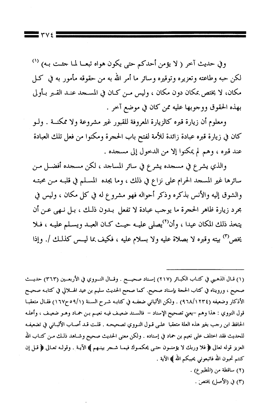 وفي حديث آخر (لا يؤمن أحدكم حتى يكون هواه تبعًا لما جئت به) لكن حبه وطاعته وتعزيره وتوقيره وسائر ما أمر الله به من حقوقه مأمور به في كل مكان، لا يختص بمكان دون مكان، وليس من كان في المسجد عند القبر بأولى بهذه الحقوق ووجوبها عليه ممن كان في موضع آخر.
