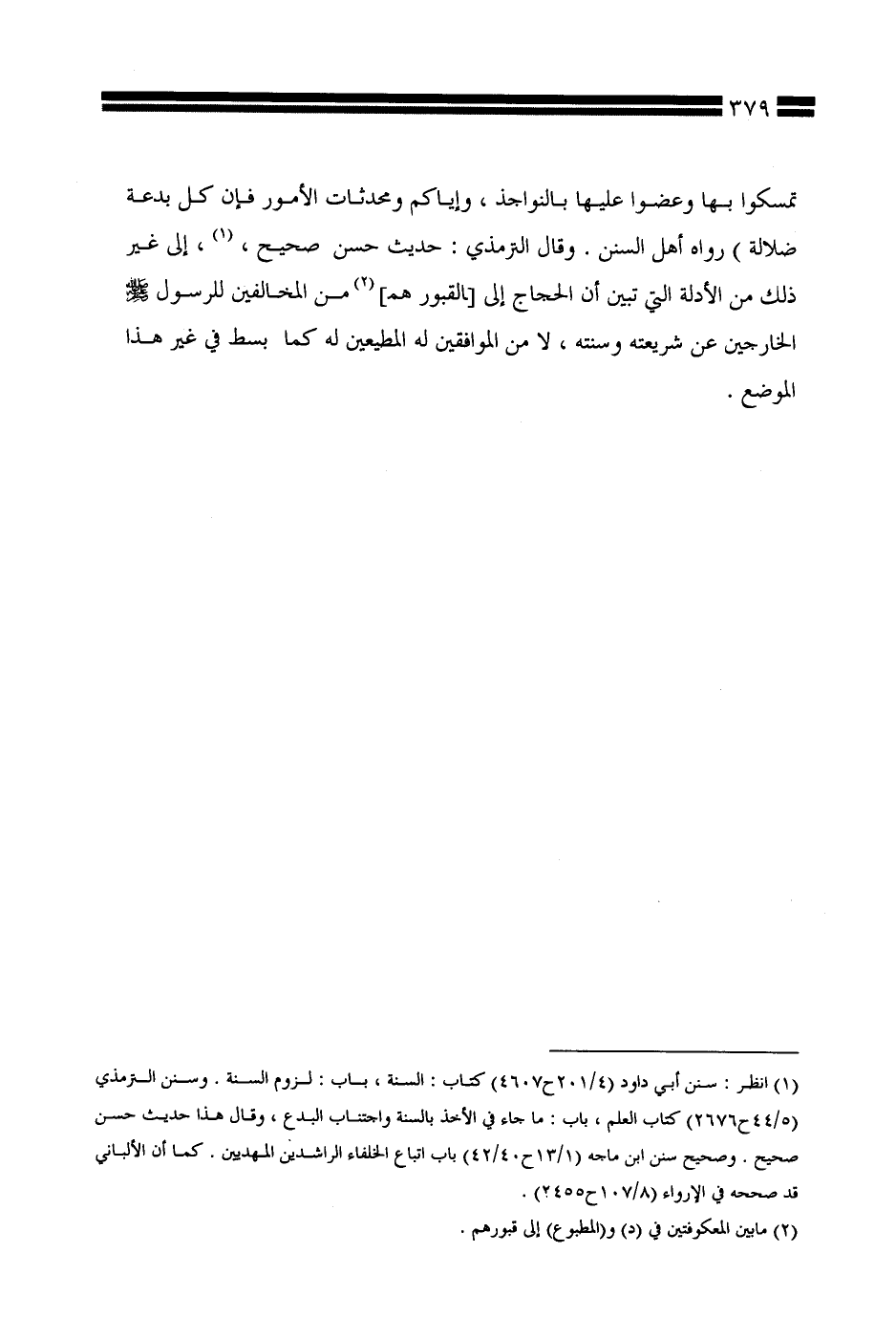 تمسكوا بها وعضوا عليها بالنواجذ، وإياكم ومحدثات الأمور فإن كل بدعة ضلالة) رواه أهل السنن. وقال الترمذي: حديث حسن صحيح، إلى غير ذلك من الأدلة التي بين أن الحجاج إلى [القبور هم] من المخالفين للرسول صلى الله عليه وسلم الخارجين عن شريعته وسنته، لا من الموافقين له المطيعين له كما بسط في غير هذا الموضع.