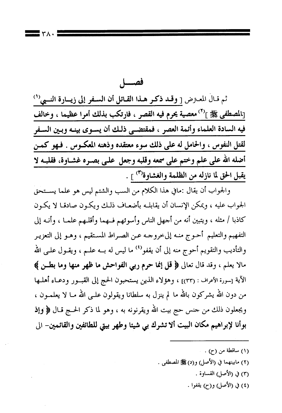 ـ[وقد ذكر هذا القائل أن السفر إلى زيارة النبي [المصطفى صلى الله عليه وسلم] معصية يحرم فيه القصر، فارتكب بذلك أمرًا عظيمًا، وخالف فيه السادة العلماء وأئمة العصر، فمقتضى ذلك أن يسوى بينه وبين السفر لقتل النفوس، والحامل له على ذلك سوء معتقده وذهنه المعكوس. فهو كمن أضله الله على علم وختم على سمعه وقلبه وجعل على بصره غشاوة، فقلبه لا يقبل الحق لما نازله من الظلمة والغشاوة.]ـ