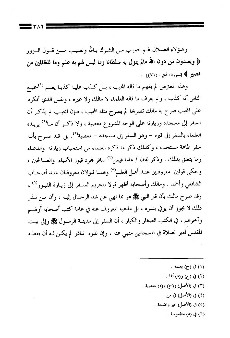 وهذا المعترض لم يفهم ما قاله المجيب، بل كذب عليه كذبًا يعلم جميع الناس أنه كذب، ولم يعرف ما قاله العلماء لا مالك ولا غيره، ونفس الذي أنكره على المجيب صرح به مالك تصريحًا لم يصرح مثله المجيب، فإن المجيب لم يذكر أن السفر إلى مسجده وزيارته على الوجه المشروع معصية، ولا ذكر أن ما يريده العلماء بالسفر إلى قبره -وهو السفر إلى مسجده- معصية. بل قد صرح بأنه سفر طاعة مستحب، وكذلك ذكر ما ذكره العلماء من استحباب زيارته والدعاء وما يتعلق بذلك. وذكر لفظًا / عامًّا فيمن سافر لمجرد قبور الأنبياء والصالحين، وحكى قولين معروفين عند أهل العلم وهما قولان معروفان عند أصحاب الشافعي وأحمد. ومالك وأصحابه أظهر قولاً بتحريم السفر إلى زيارة القبور، وقد صرح مالك بأن قبر النبي صلى الله عليه وسلم هو مما نهي عن شد الرحال إليه، وأن من نذر ذلك لا يجوز أن يوفي بنذره، بل مذهبه المعروف عنه في عامة كتب أصحابه أولهم وآخرهم، في الكتب الصغار والكبار، أن السفر إلى مدينة الرسول صلى الله عليه وسلم وإلى بيت المقدس لغير الصلاة في المسجدين منهي عنه، وإن نذره ناذر لم يكن له أن يفعله