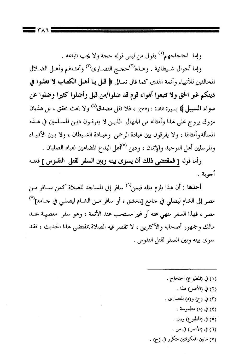 أحدها: أن هذا يلزم مثله فيمن سافر إلى المساجد للصلاة كمن سافر من مصر إلى الشام ليصلي في جامع [دمشق، أو سافر من الشام ليصلي في جامع] مصر، فهذا السفر منهي عنه أو غير مستحب عند الأئمة، وهو سفر معصية عند مالك وجمهور أصحابه والأكثرين، لا تقصر فيه الصلاة بمقتضى هذا الحديث، فقد سوى بينه وبين السفر لقتل النفوس.