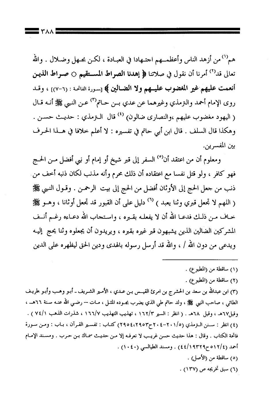 ومعلوم أن من اعتقد أن السفر إلى قبر شيخ أو إمام أو نبي أفضل من الحج فهو كافر، ولو قتل نفسًا مع اعتقاده أن ذلك محرم وأنه مذنب لكان ذنبه أخف من ذنب من جعل الحج إلى الأوثان أفضل من الحج إلى بيت الرحمن. وقول النبي صلى الله عليه وسلم (اللهم لا تجعل قبري وثنًا يعبد) دليل على أن القبور قد تجعل أوثانًا، وهو صلى الله عليه وسلم خاف من ذلك فدعا الله أن لا يفعله بقبره، واستجاب الله دعاءه رغم أنف المشركين الضالين الذين يشبهون قبر غيره بقبره، ويريدون أن يجعلوه وثنًا يحج إليه ويدعى من دون الله، / والله قد أرسل رسوله بالهدى ودين الحق ليظهره على الدين