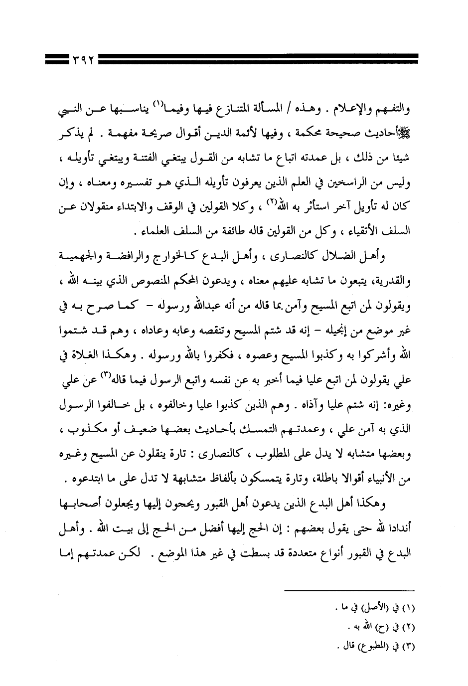 والتفهم والإعلام. وهذه / المسألة المتنازع فيها وفيما يناسبها عن النبي صلى الله عليه وسلم أحاديث صحيحة محكمة، وفيها لأئمة الدين أقوال صريحة مفهمة. لم يذكر شيئًا من ذلك، بل عمدته اتباع ما تشابه من القول يبتغي الفتنة ويبتغي تأويله، وليس من الراسخين في العلم الذي يعرفون تأويله الذي هو تفسيره ومعناه، وإن كان له تأويل آخر استأثر به الله، وكلا القولين في الوقف والابتداء منقولان عن السلف الأتقياء، وكل من القولين قاله طائفة من السلف العلماء.
