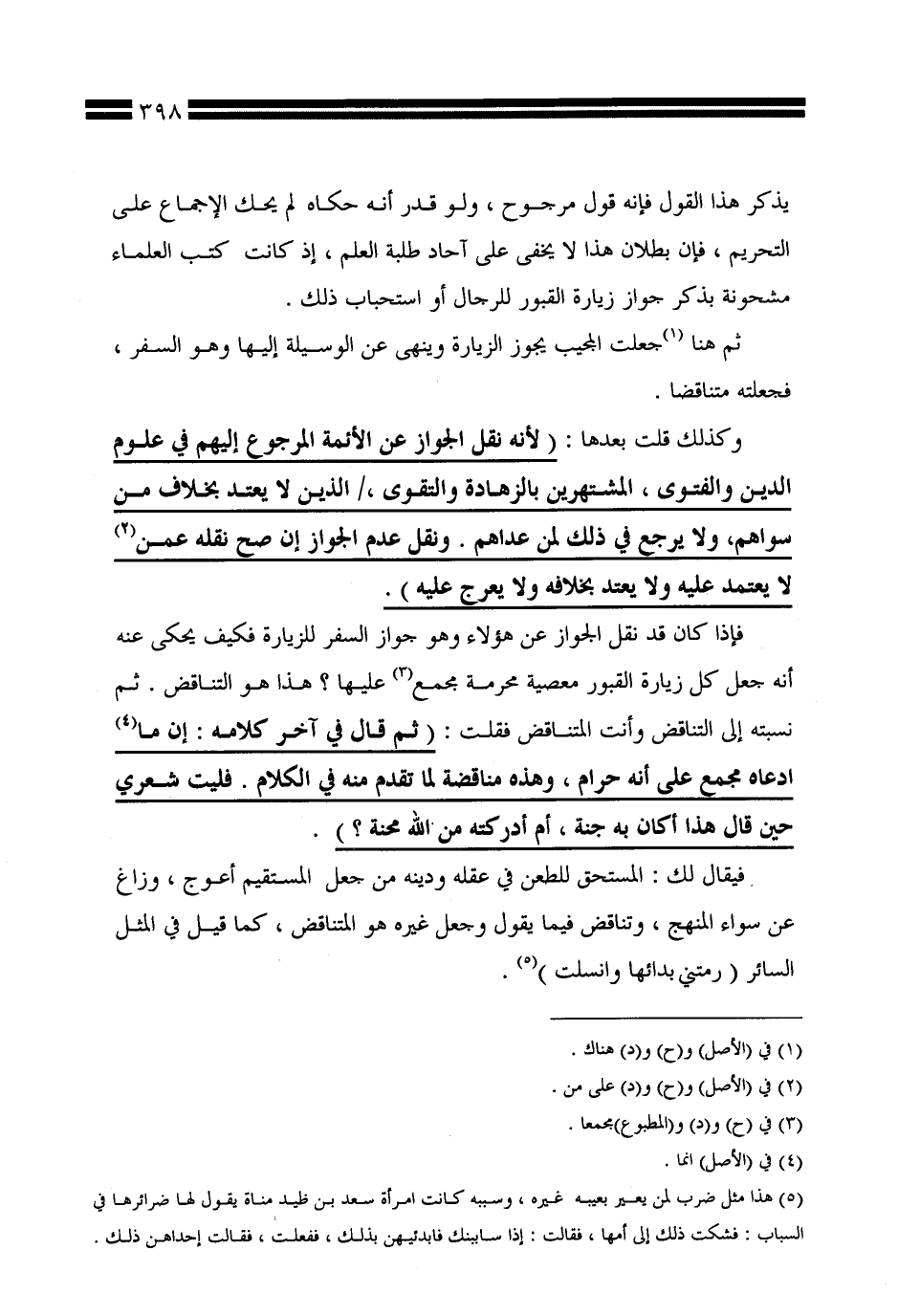 فإذا كان قد نقل الجواز عن هؤلاء وهو جواز السفر للزيارة فكيف يحكى عنه أنه جعل كل زيارة القبور معصية محرمة مجمع عليها؟ هذا هوالتناقض. ثم نسبته إلى التناقض وأنت المتناقض فقلت: