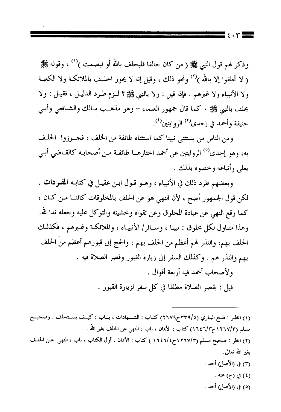 وبعضهم طرد ذلك في الأنبياء، وهو قول ابن عقيل في كتابه المفردات. لكن قول الجمهور أصح، لأن النهي هو عن الحلف بالمخلوقات كائنًا من كان، كما وقع النهي عن عبادة المخلوق وعن تقواه وخشيته والتوكل عليه وجعله ندًّا لله. وهذا متناول لكل مخلوق: نبينا، وسائر الأنبياء، والملائكة وغيرهم، فكذلك الحلف بهم، والنذر لهم أعظم من الحلف بهم، والحج إلى قبورهم أعظم من الحلف بهم والنذر لهم. وكذلك السفر إلى زيارة القبور وقصر الصلاة فيه.