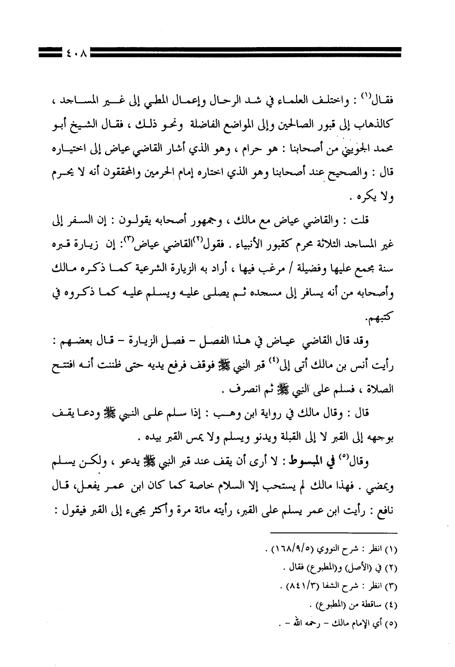 قلت: والقاضي عياض مع مالك، وجمهور أصحابه يقولون: إن السفر إلى غير المساجد الثلاثة محرم كقبور الأنبياء. فقول القاضي عياض: إن زيارة قبره سنة مجمع عليها وفضيلة / مرغب فيها، أراد به الزيارة الشرعية كما ذكره مالك وأصحابه من أنه يسافر إلى مسجده ثم يصلى عليه ويسلم عليه كما ذكروه في كتبهم.