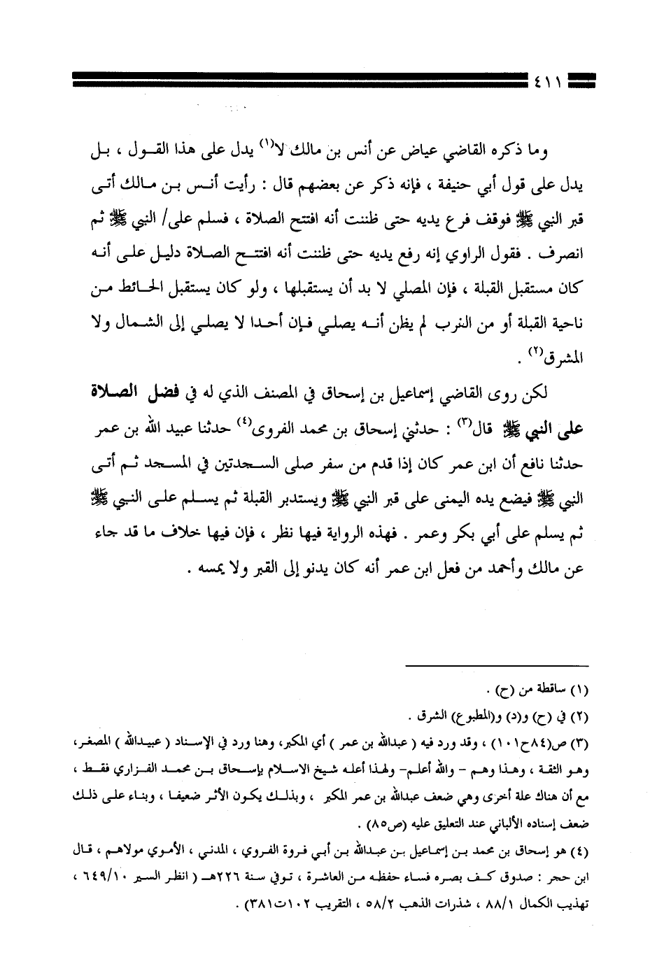 لكن روى القاضي إسماعيل بن إسحاق في المصنف الذي له في فضل الصلاة على النبي صلى الله عليه وسلم قال: حدثني إسحاق بن محمد الفروي حدثنا عبيد الله بن عمر حدثنا نافع أن ابن عمر كان إذا قدم من سفر صلى السجدتين في المسجد ثم أتى النبي صلى الله عليه وسلم فيضع يده اليمنى على قبر النبي صلى الله عليه وسلم ويستدبر القبلة ثم يسلم على النبي صلى الله عليه وسلم ثم يسلم على أبي بكر وعمر. فهذه الرواية فيها نظر، فإن فيها خلاف ما قد جاء عن مالك وأحمد من فعل ابن عمر أنه كان يدنو إلى القبر ولا يمسه.