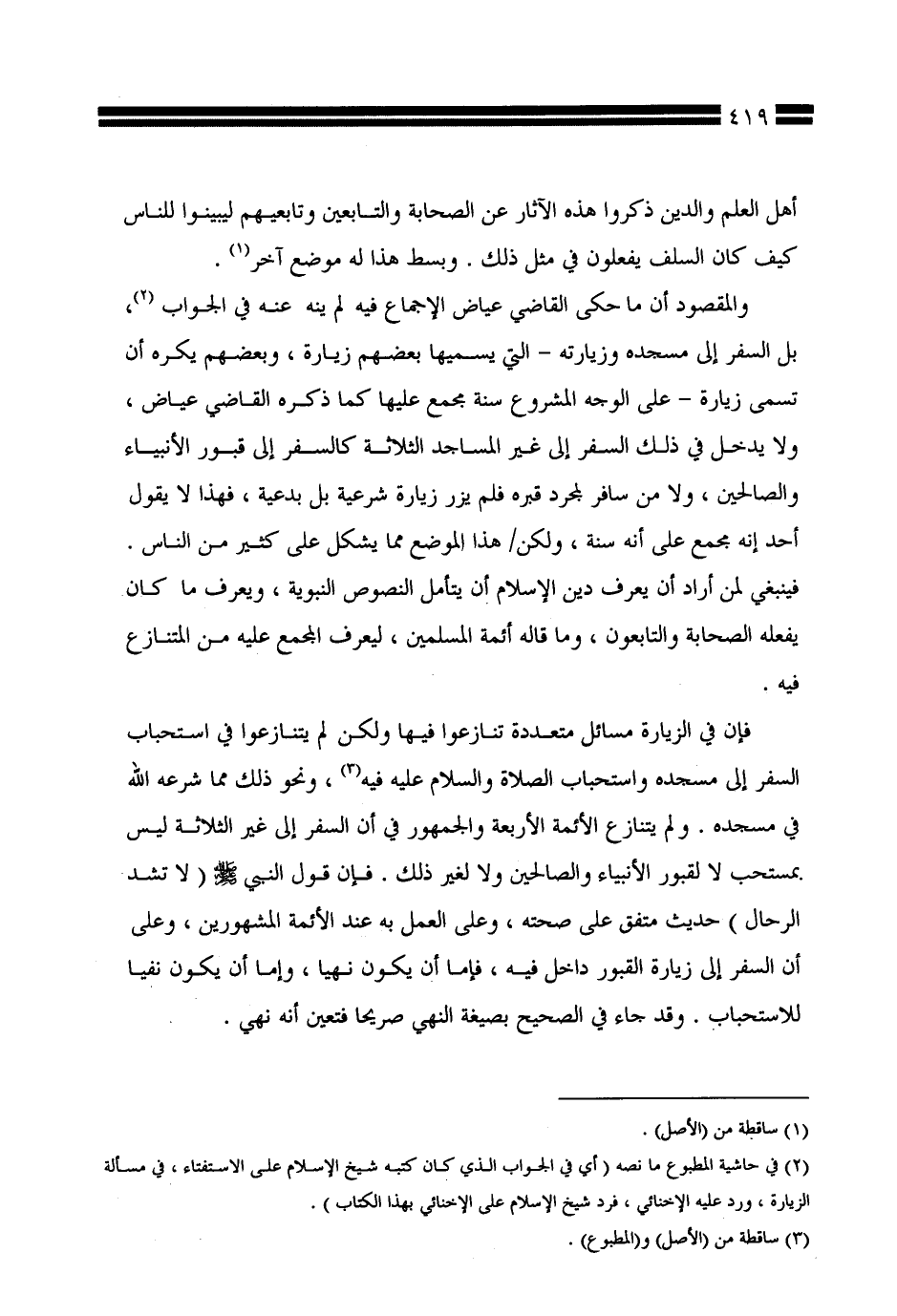 فإن في الزيارة مسائل متعددة تنازعوا فيها ولكن لم يتنازعوا في استحباب السفر إلى مسجده واستحباب الصلاة والسلام عليه فيه، ونحو ذلك مما شرعه الله في مسجده. ولم يتنازع الأئمة الأربعة والجمهور في أن السفر إلى غير الثلاثة ليس بمستحب لا لقبور الأنبياء والصالحين ولا لغير ذلك. فإن قول النبي صلى الله عليه وسلم (لا تشد الرحال) حديث متفق على صحته، وعلى العمل به عند الأئمة المشهورين، وعلى أن السفر إلى زيارة القبور داخل فيه، فإما أن يكون نهيًا، وإما أن يكون نفيًا للاستحباب. وقد جاء في الصحيح بصيغة النهي صريحًا فتعين أنه نهي.