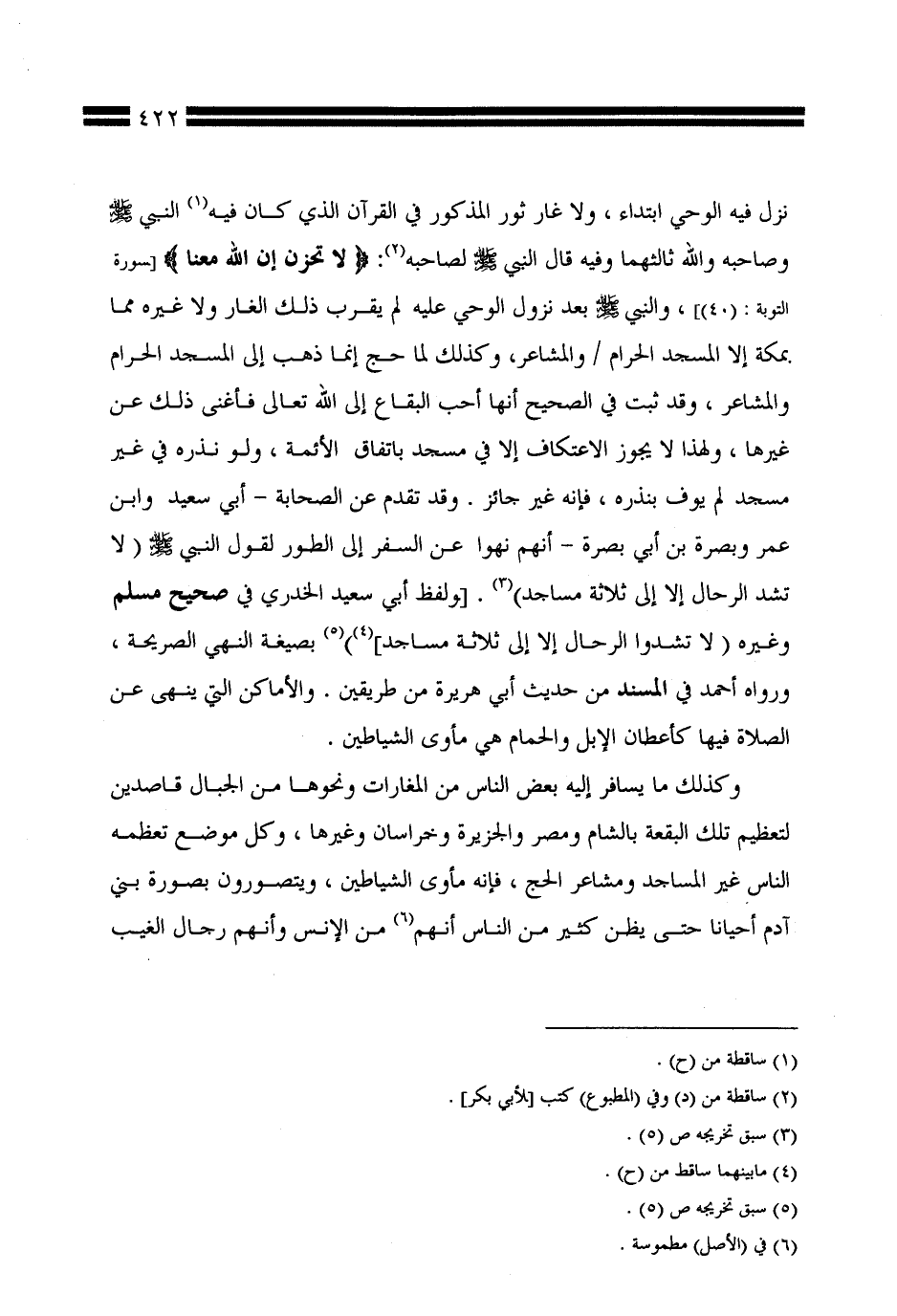 نزل فيه الوحي ابتداء، ولا غار ثور المذكور في القرآن الذي كان فيه النبي صلى الله عليه وسلم وصاحبه والله ثالثهما وفيه قال النبي صلى الله عليه وسلم لصاحبه: {لا تحزن إن الله معنا} [سورة التوبة: 40]، والنبي صلى لله عليه وسلم بعد نزول الوحي عليه لم يقرب ذلك الغار ولا غيره مما بمكة إلا المسجد الحرام / والمشاعر، وكذلك لما حج إنما ذهب إلى المسجد الحرام والمشاعر، وقد ثبت في الصحيح أنها أحب البقاع إلى الله تعالى فأغنى ذلك عن غيرها، ولهذا لا يجوز الاعتكاف إلا في مسجد باتفاق الأئمة، ولو نذره في غير مسجد لم يوف بنذره، فإنه غير جائز. وقد تقدم عن الصحابة -أبي سعيد وابن عمر وبصرة بن أبي بصرة- أنهم نهوا عن السفر إلى الطور لقول النبي صلى الله عليه وسلم (لا تشد الرحال إلا إلى ثلاثة مساجد). [ولفظ أبي سعيد الخدري في صحيح مسلم وغيره (لا تشدوا الرحال إلا إلى ثلاثة مساجد)] بصيغة النهي الصريحة، ورواه أحمد في المسند من حديث أبي هريرة من طريقين. والأماكن التي ينهى عن الصلاة فيها كأعطان الإبل والحمام هي مأوى الشياطين.