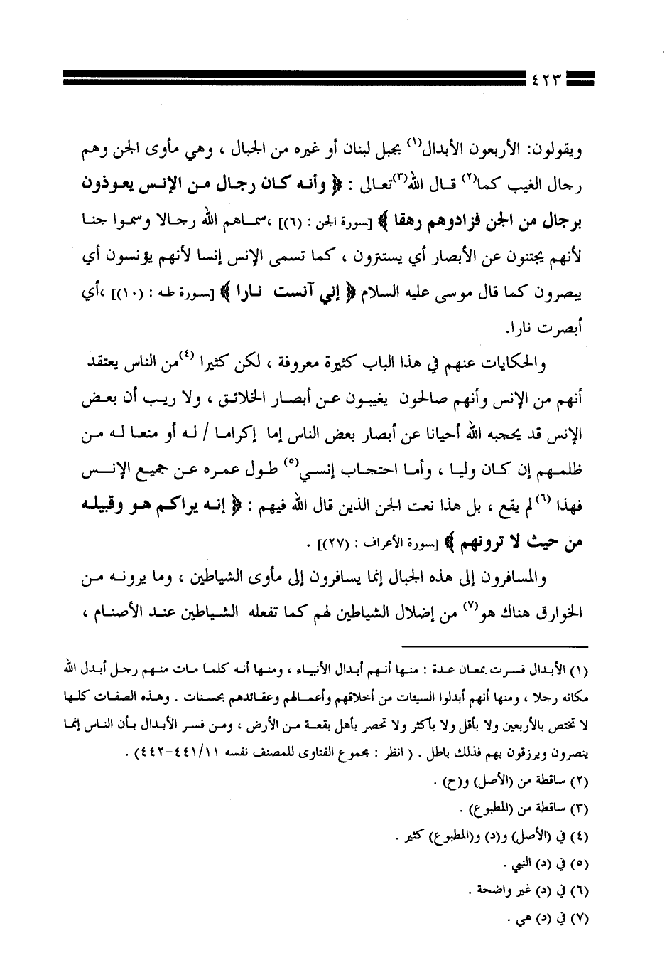 والحكايات عنهم في هذا الباب كثيرة معروفة، لكن كثيرًا من الناس يعتقد أنهم من الإنس وأنهم صالحون يغيبون عن أبصار الخلائق، ولا ريب أن بعض الإنس قد يحجبه الله أحيانًا عن أبصار بعض الناس إما إكرامًا / له أو منعًا له من ظلمهم إن كان وليًّا، وأما احتجاب إنسي طول عمره عن جميع الإنس فهذا لم يقع، بل هذا نعت الجن الذين قال الله فيهم: {إنه يراكم هو وقبيله من حيث لا ترونهم} [سورة الأعراف: (27)].